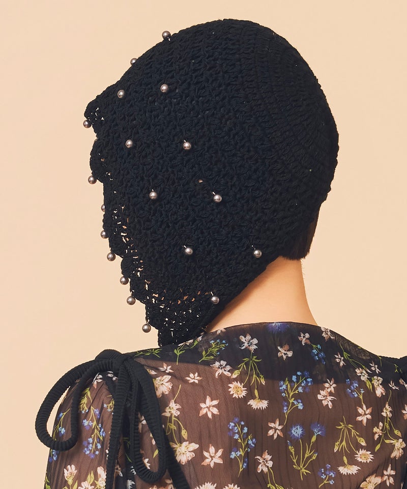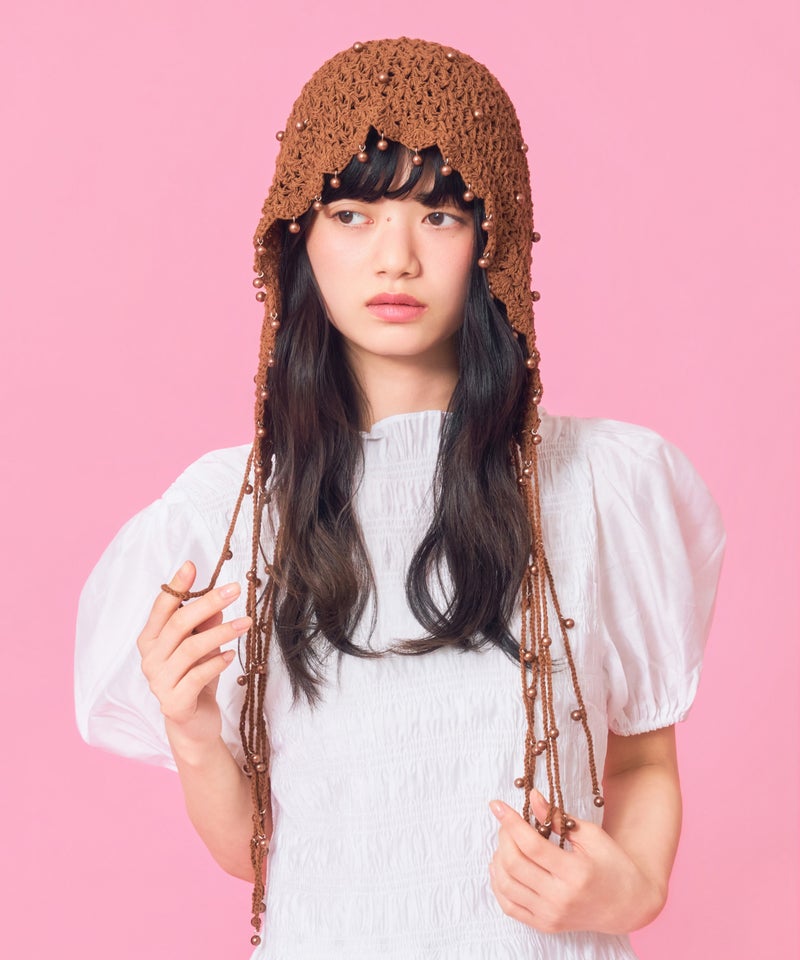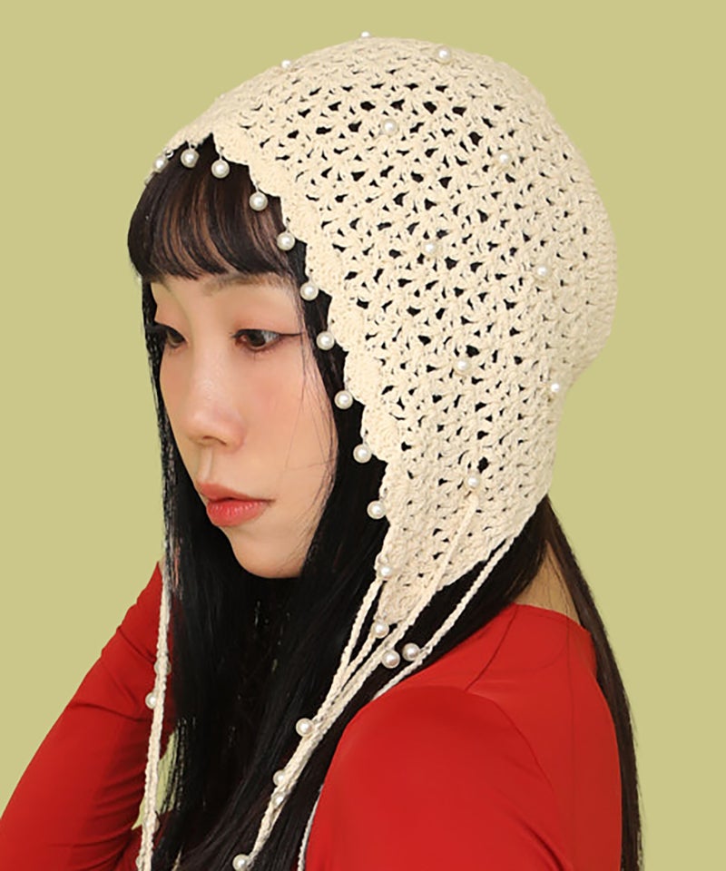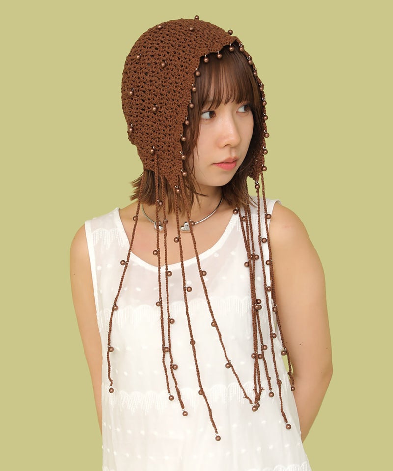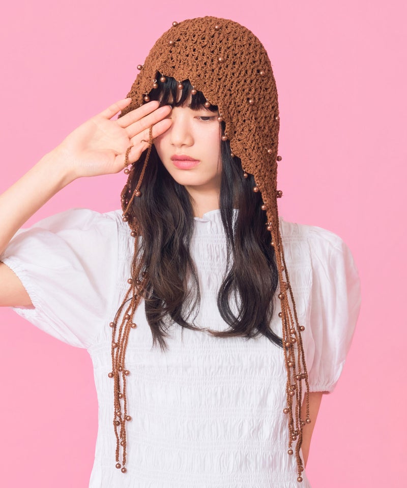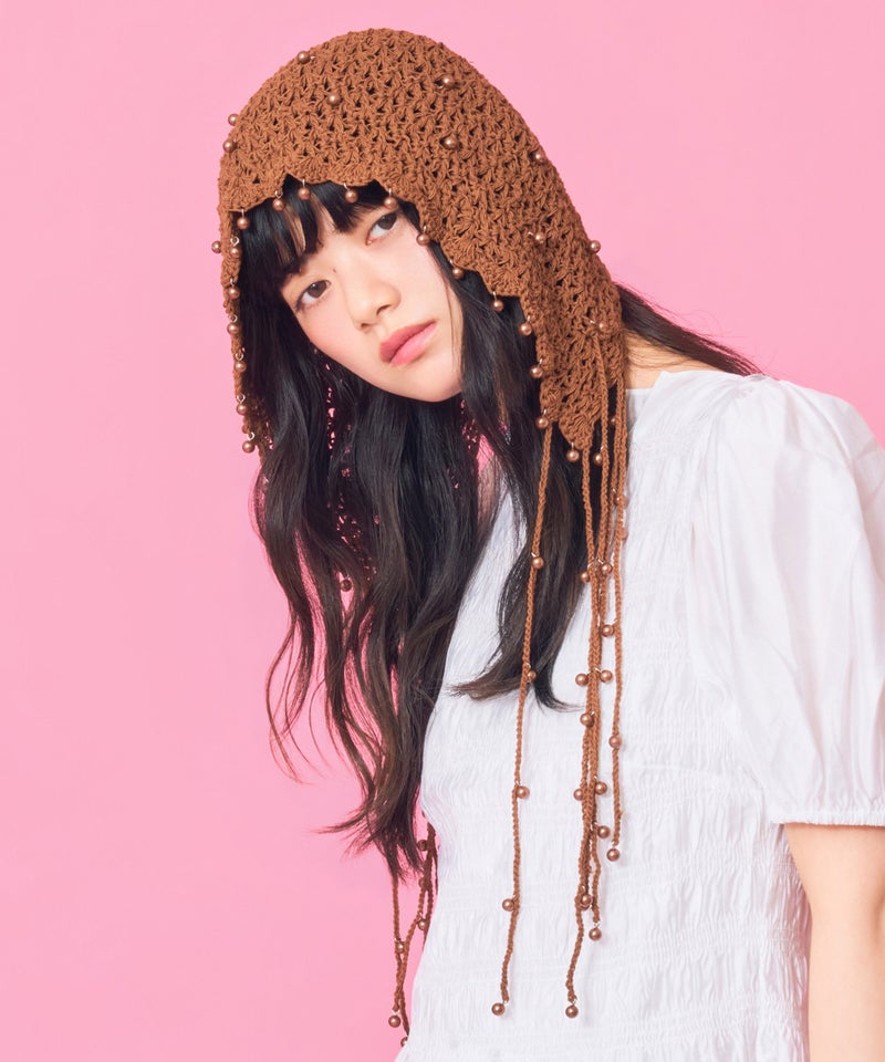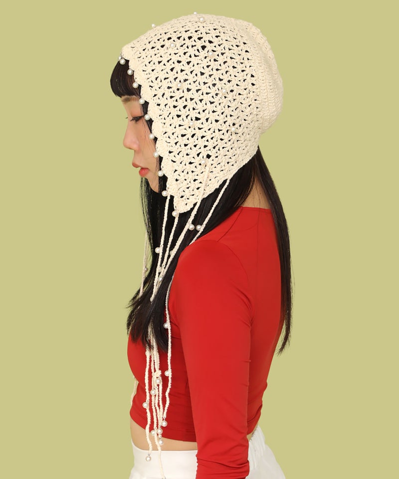 夏らしい透かし編みの本体に、一つ一つ金具でビーズを付けたアートピースのようなアイテムです。
