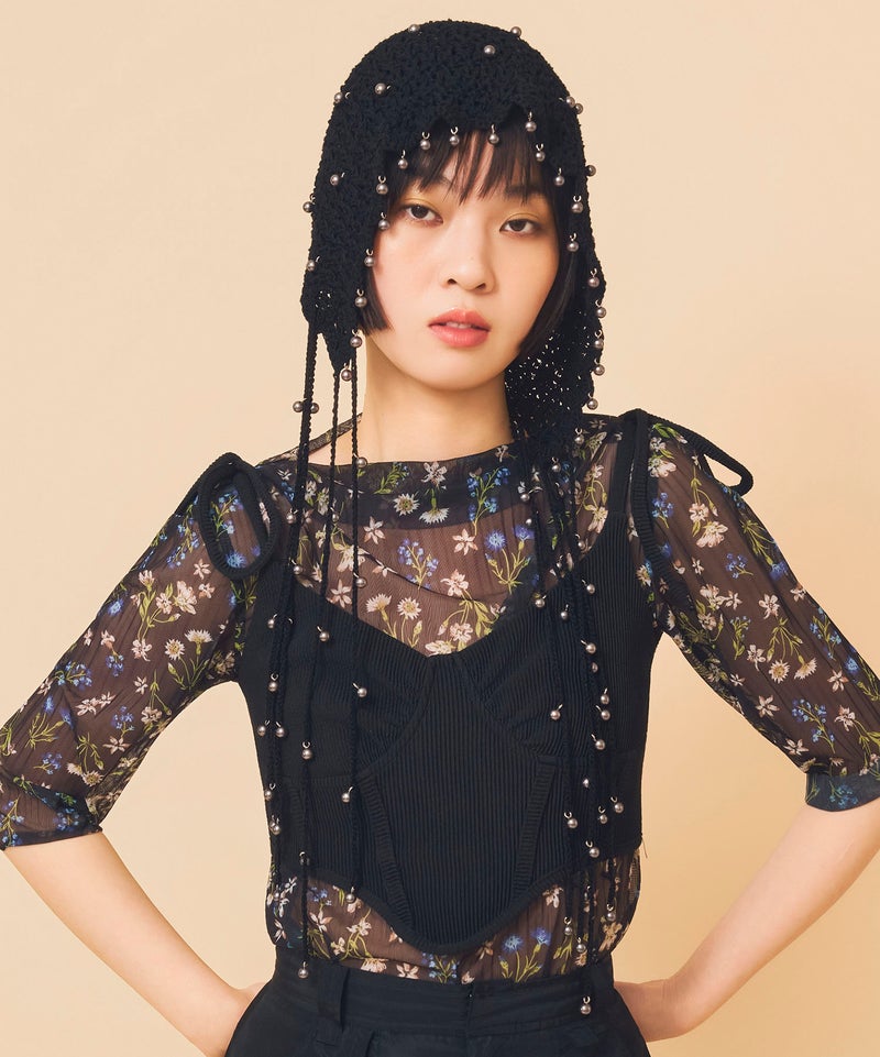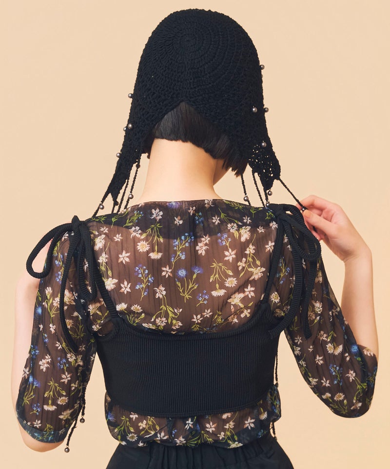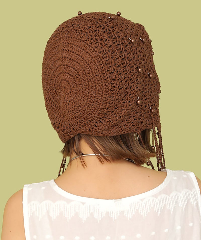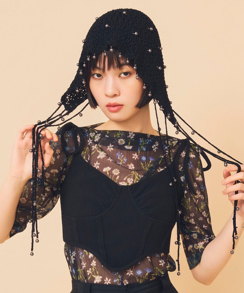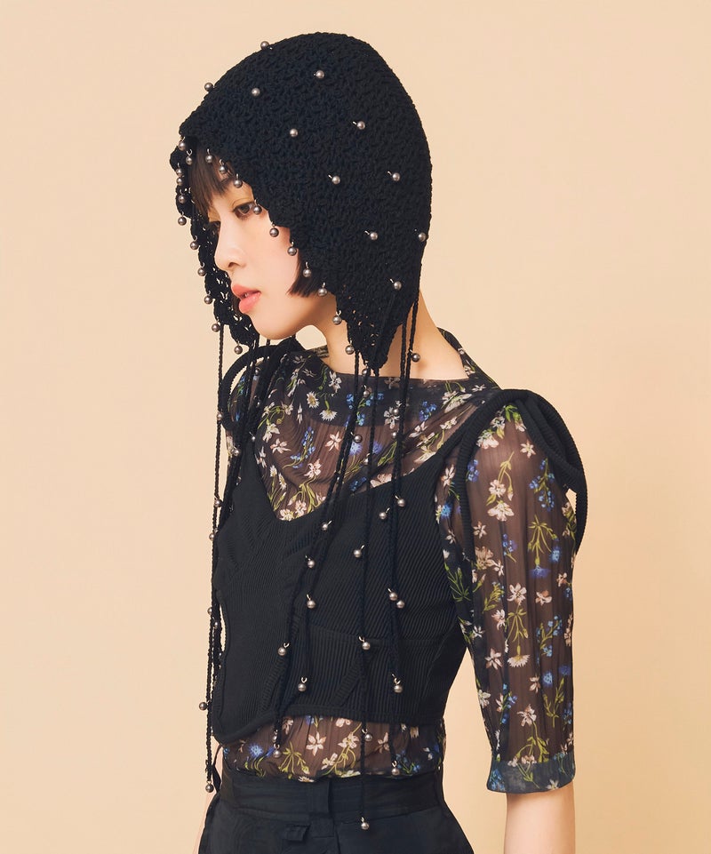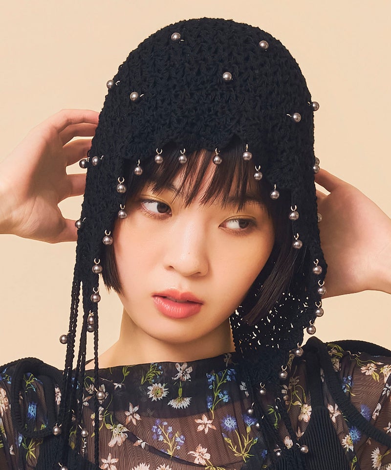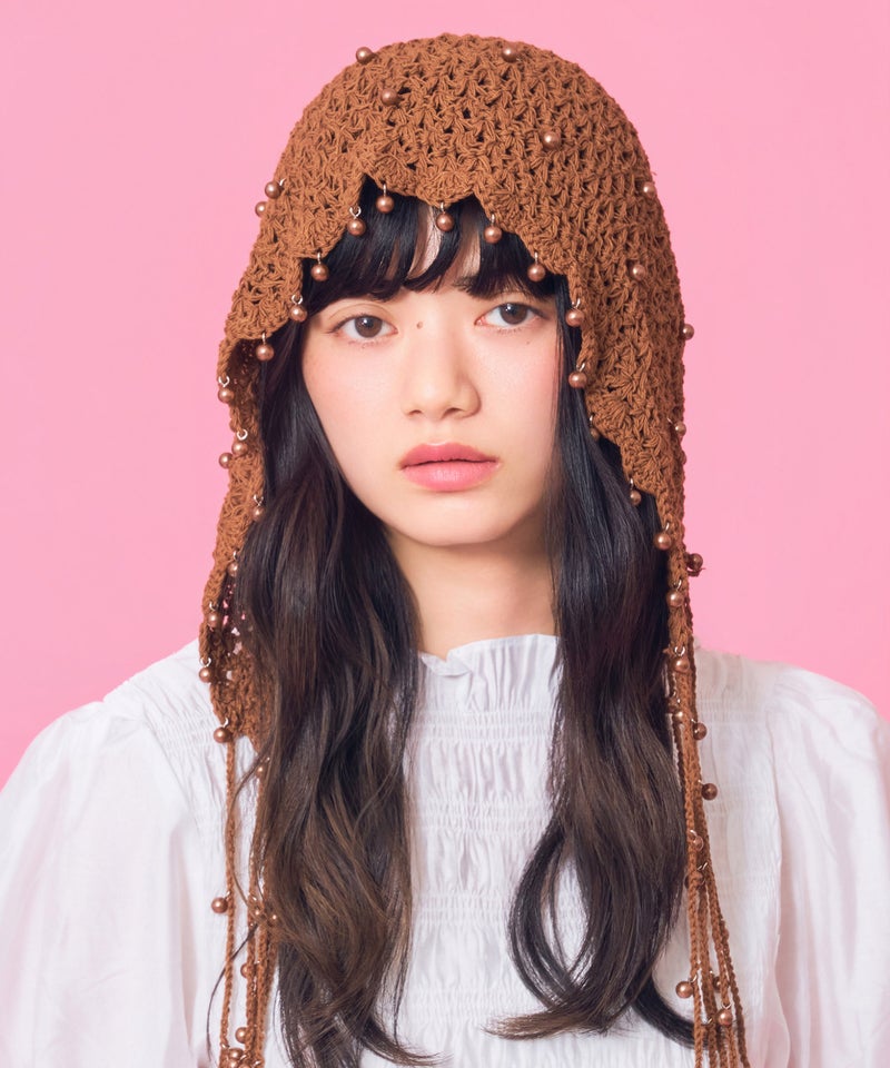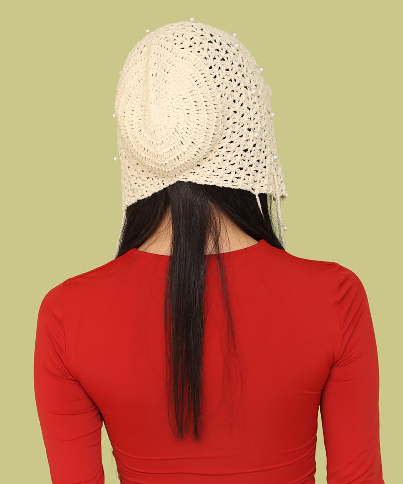 夏らしい透かし編みの本体に、一つ一つ金具でビーズを付けたアートピースのようなアイテムです。