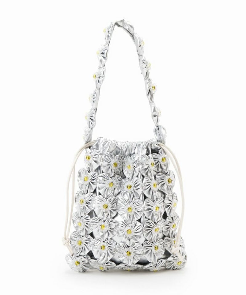 真ん中にWoodビーズを付けてハートモチーフを繋げた、アクセサリー感覚で持てるBAGです。