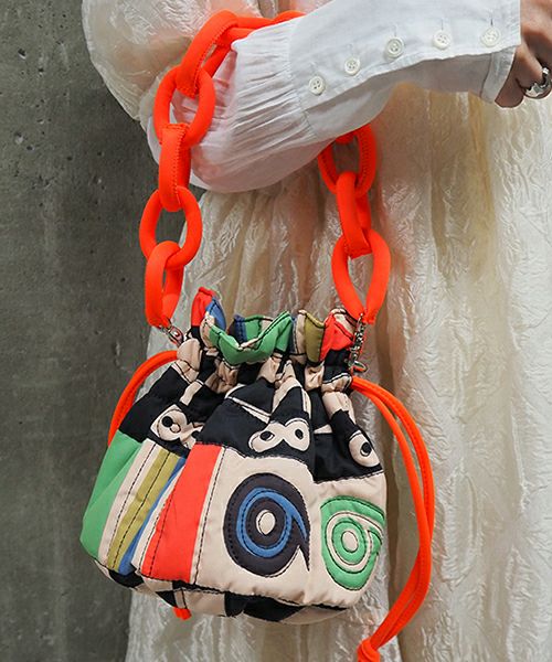 ヴィンテージスカーフなどから着想を得たテキスタイルを大胆に使用したアイテム。生地の上からさらに異なる柄をキルティングしており、HEY! Mrs ROSEらしい挑戦的なテクニックを駆使して作られています。 バッグの形は丸みのあるフォルムが印象的な巾着タイプに。気分に合わせて、肩掛けにもハンドル持ちしても、色んなシーンで活躍間違いなし!肩掛けの際には、ハンドルを垂らして持つのもおすすめです。