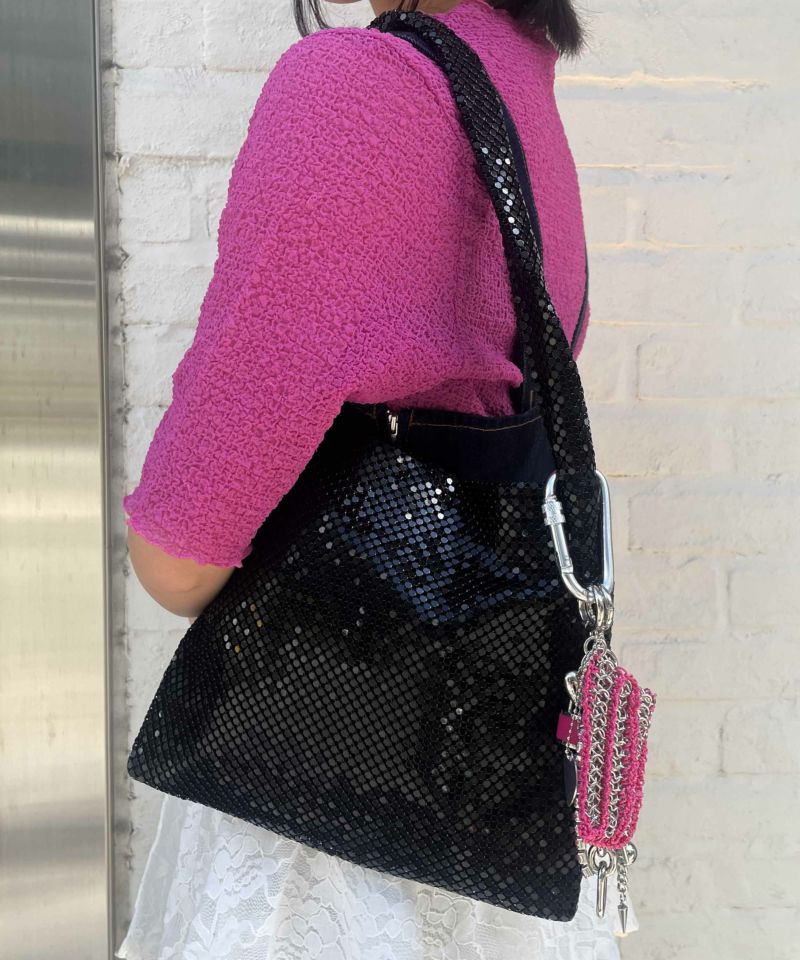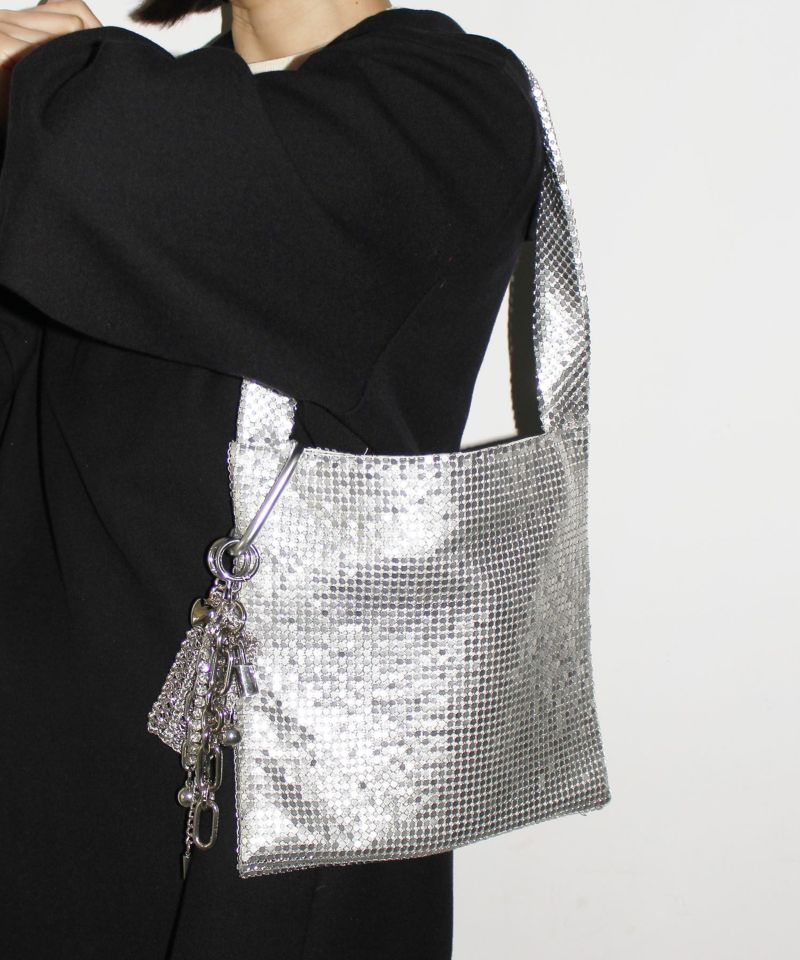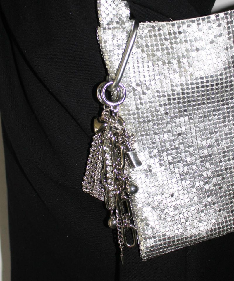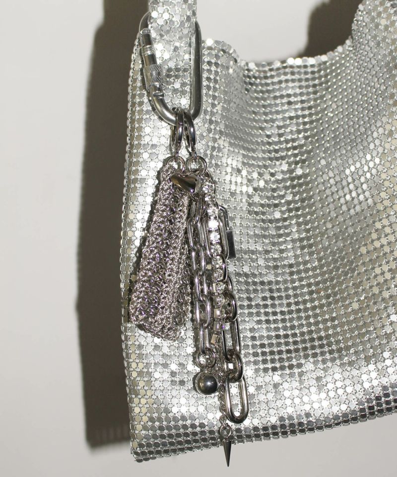 メタルメッシュのシンプルなBAGに、じゃらじゃらチェーンチャームをプラスして、ジャンヌダルク的なくさりかたびらなBAG。