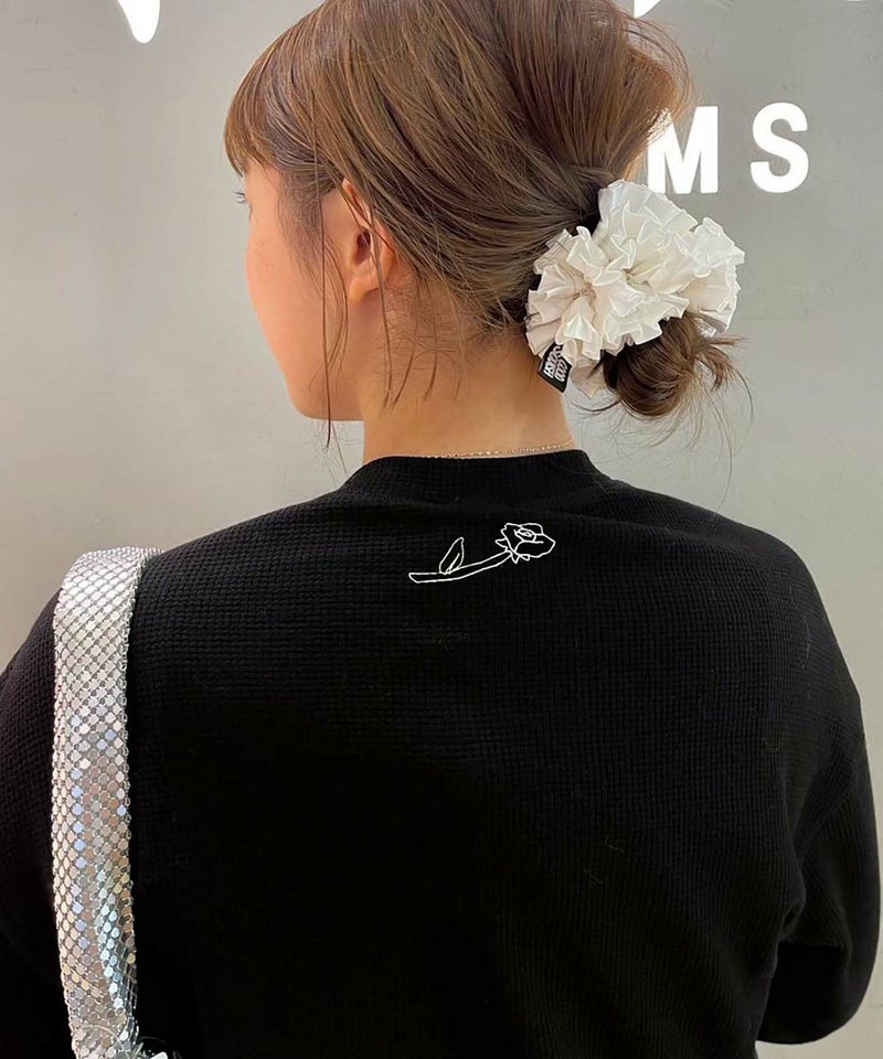 背面の首元には、ブランドアイコンのローズプリントをオン。バックスタイルまで抜かりなしで、どこから見ても“気分アガる”デザイン。