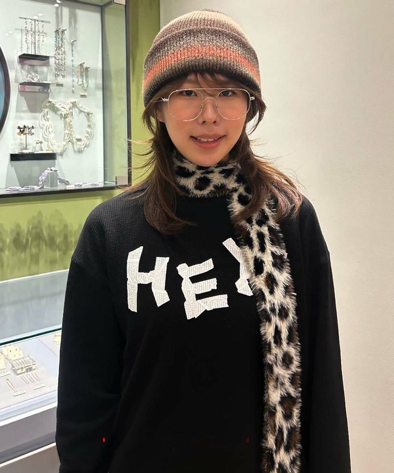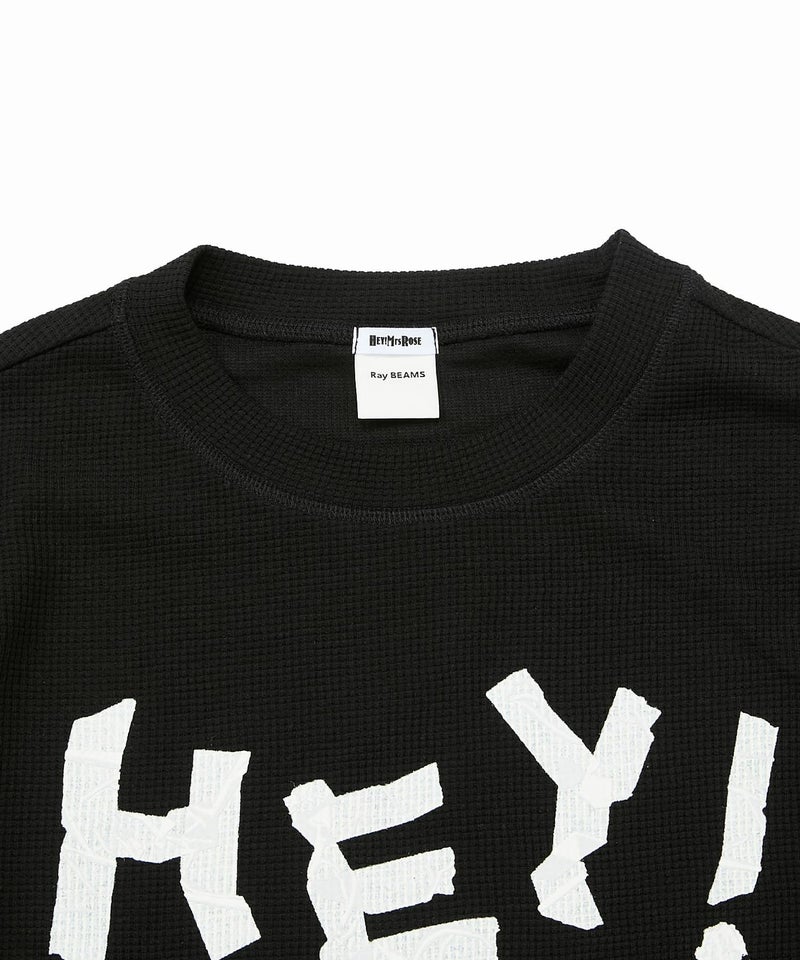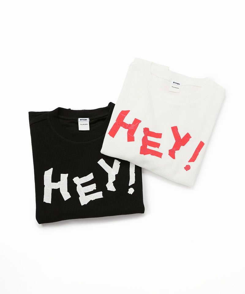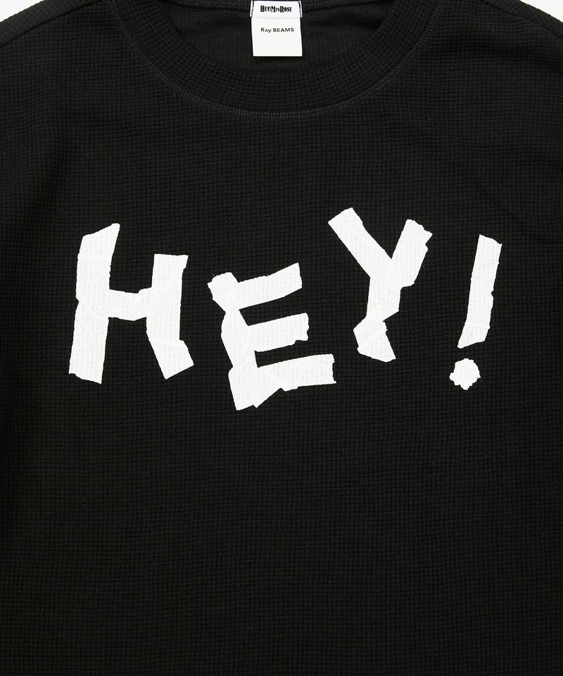 「HEY!」の文字をマスキングテープで貼ったみたいにプリントした、テンション高めなサーマルロンT。