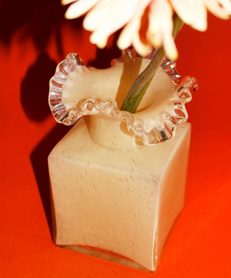 四角いフォルムが可愛らしくレトロな雰囲気を漂わせるガラスの花瓶。