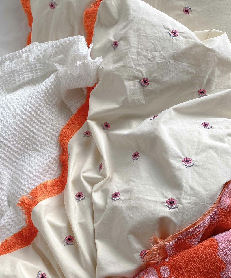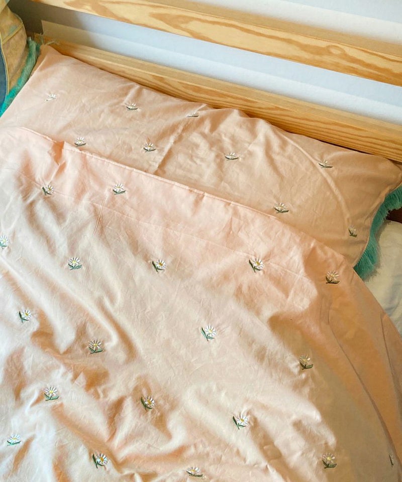 お花の刺繍やフリンジ、アクセントになるカラーリングなど、かわいいを詰め込んだ枕カバー。 メインのカラーは淡い色なので、お部屋全体が優しい雰囲気に。 コットン素材で肌触りも◎ 背面の生地は刺繍なしのため、気分を変えたいときに無地側を使いお部屋の印象を変えてみても。 シングルサイズの掛布団カバーはこちら ▶フリンジ掛布団カバー Photo by @rina_yazaki @harukawae @himitsu_ririan @fujico.109i