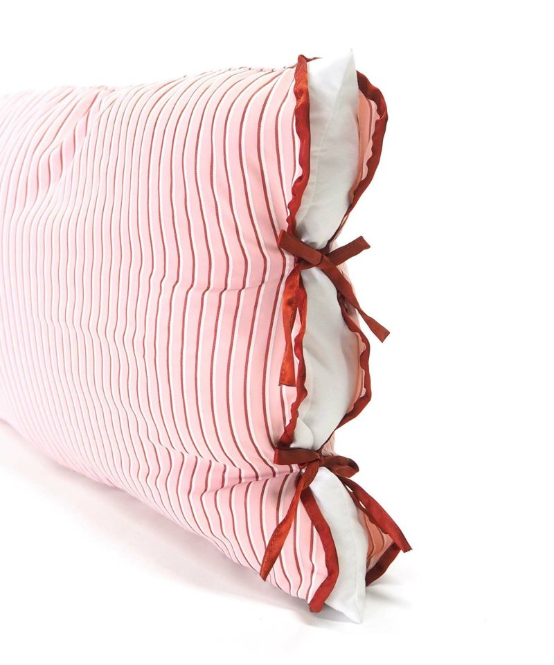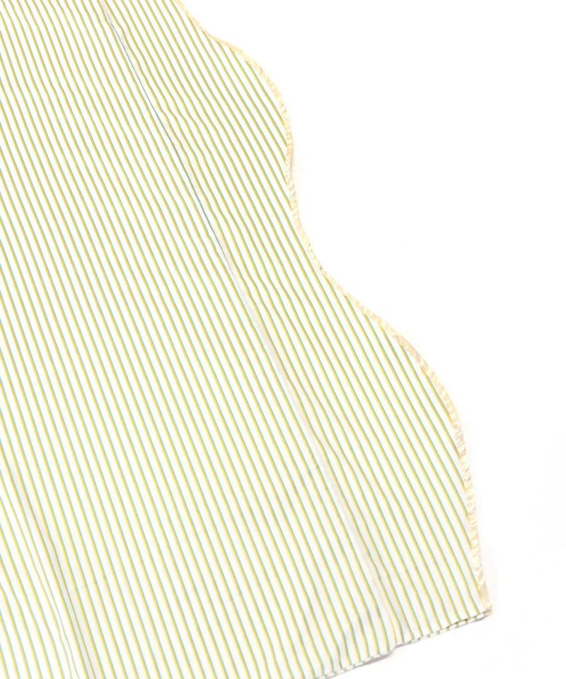 クリーンな印象のストライプに、なみなみデザインの裾とサテンリボンの組み合わせがポイント。