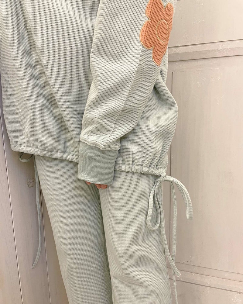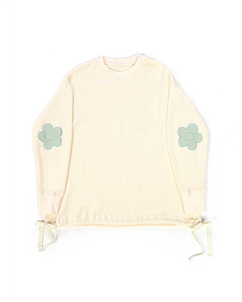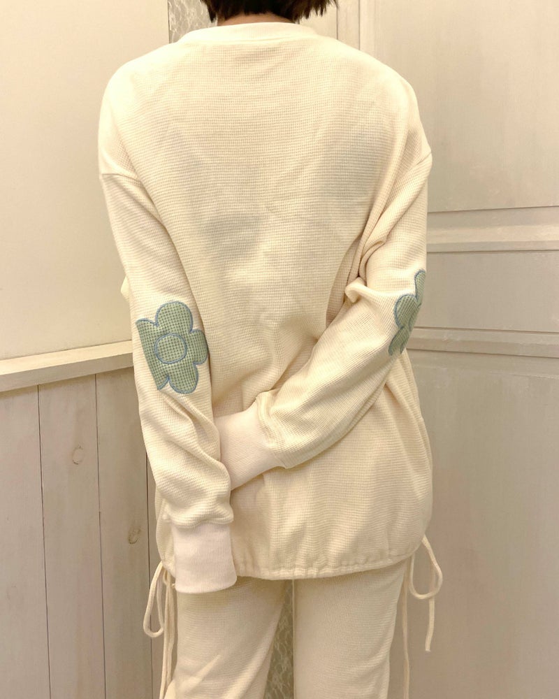 存在感を発揮しつつも主張しすぎない大きなお花の肘パッチが可愛いルームウェアトップス。
