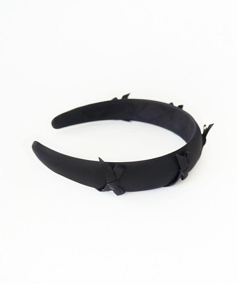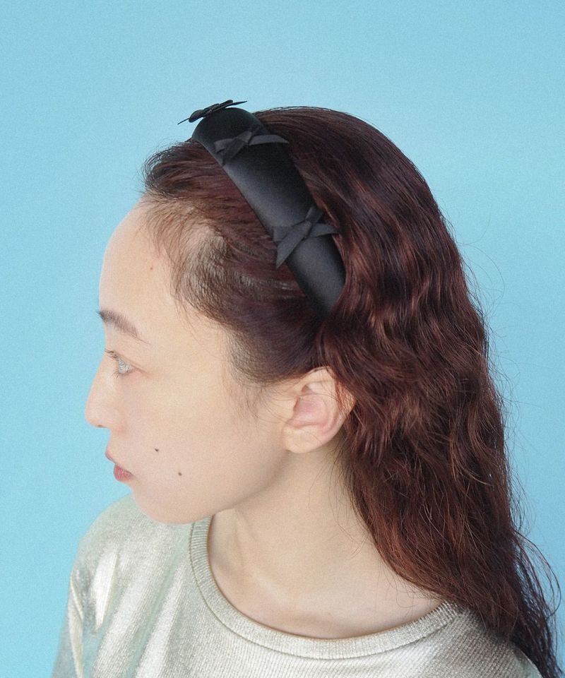 小さなリボンをあしらったサテン素材のカチューシャ。