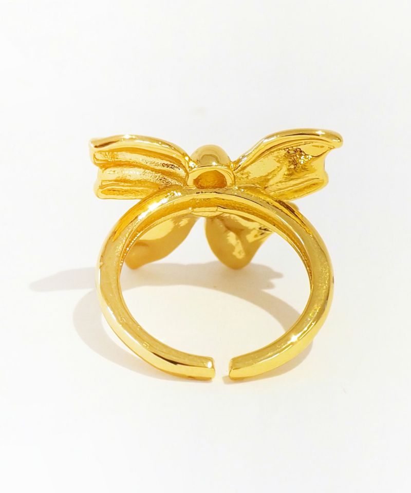 リボンモチーフが可愛いリング。 立体的なデザインが手元を華やかに見せてくれること間違いなし。 程よいボリューム感で手元にアクセントを添えてくれます。
