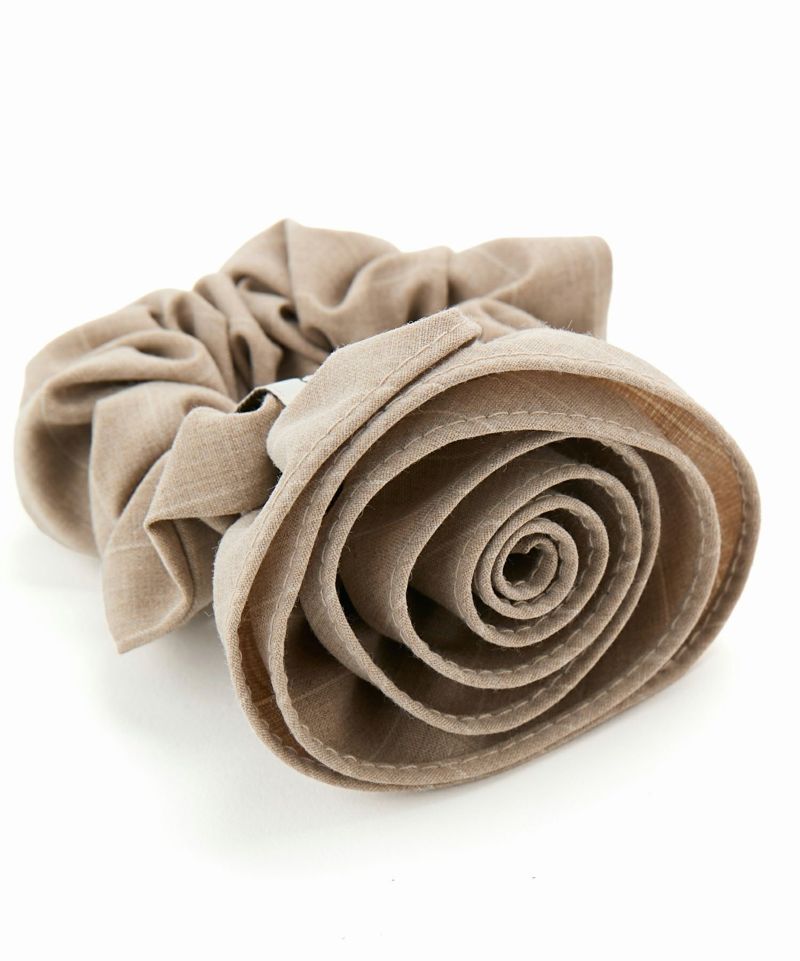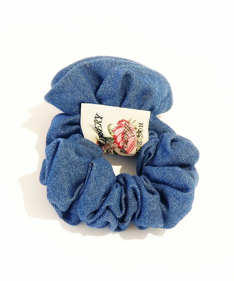 コットンのレース生地やデニム生地と、トレンドのバラモチーフの組み合わせが可愛いシュシュ。