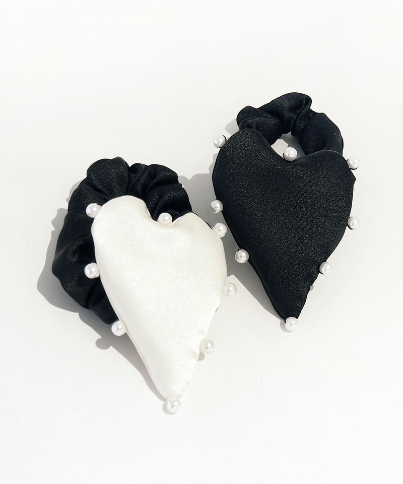 サテンのハートをパールでトリミングしたデザインのシュシュ。 程よいボリューム感がヘアアレンジのポイントに。 スタイリングにガーリーテイストを簡単にプラスできます。
