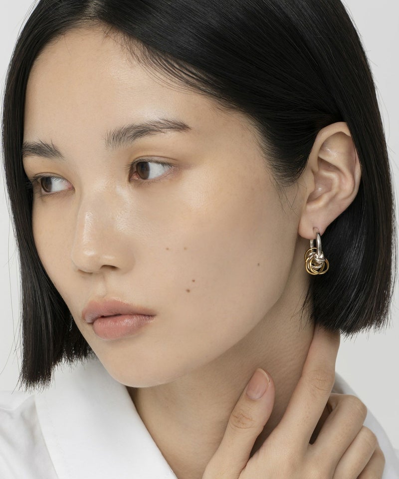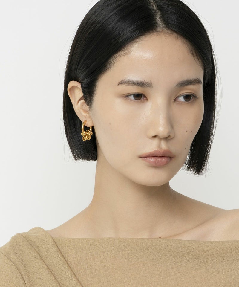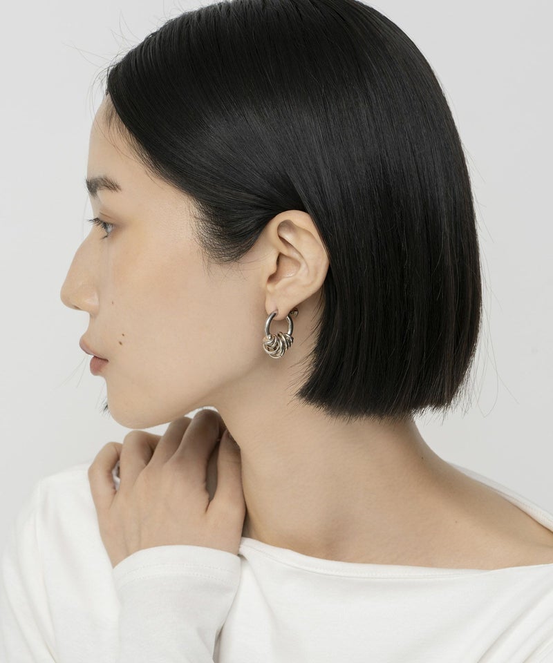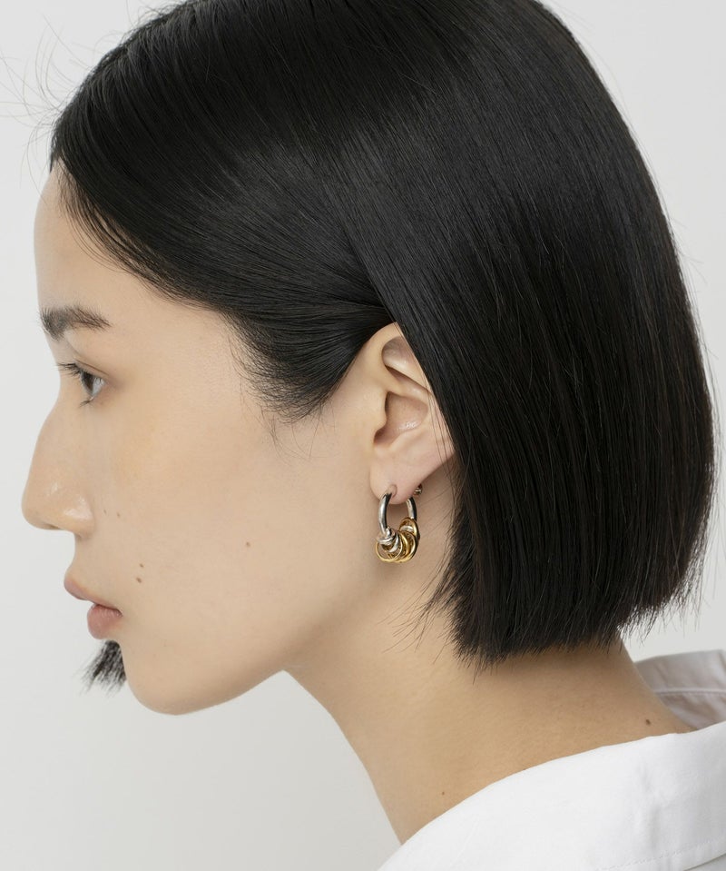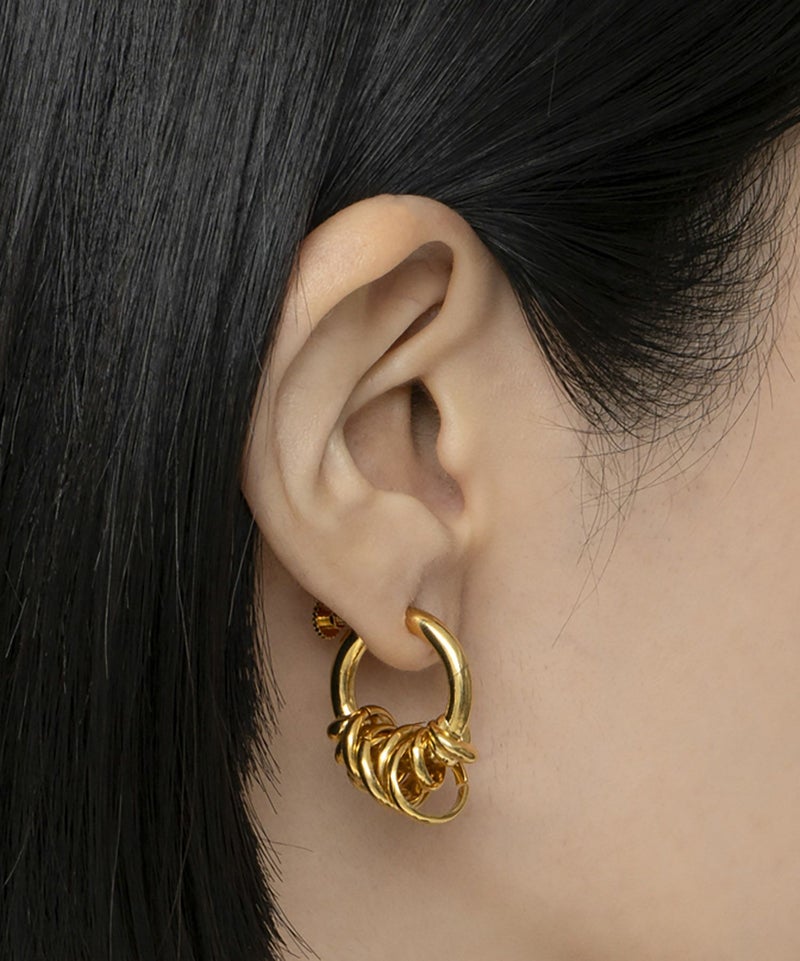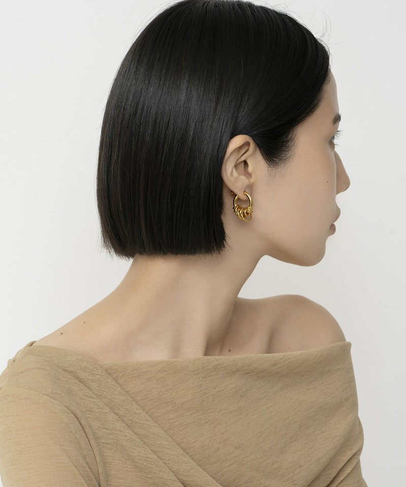 小ぶりでシンプルなイヤカフなので、どんなコーディネートにもマッチし毎日でも付けられるアイテム。一見じゃらじゃらとしたデザインですが、フープに通されたコイルは固定されており耳元で邪魔になりません。重みもなく、ストレスフリーで着けていただけるイヤカフです。