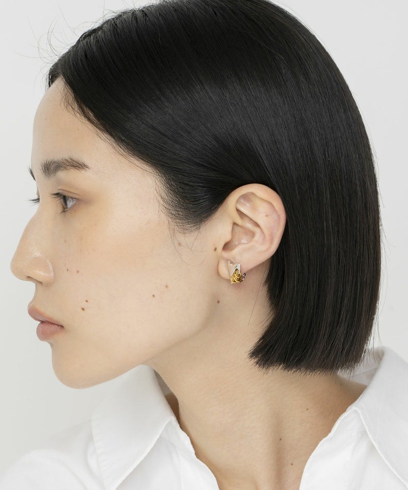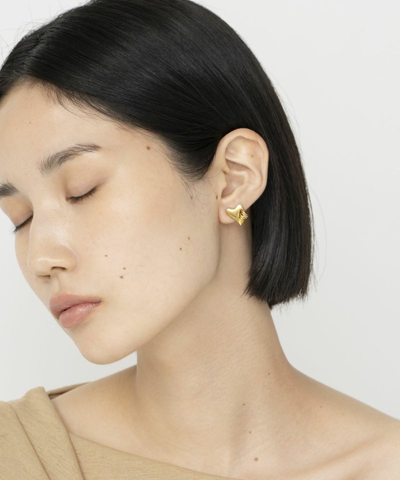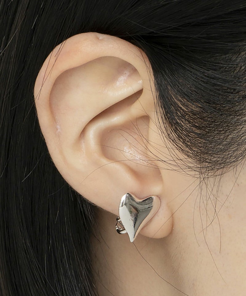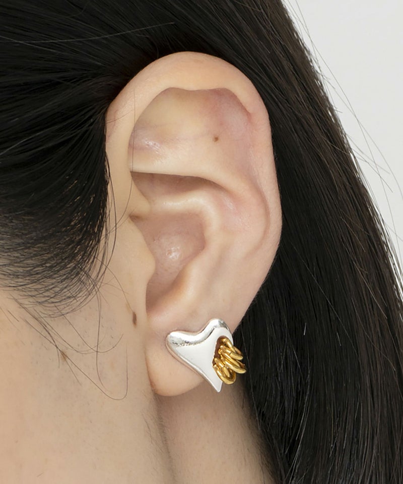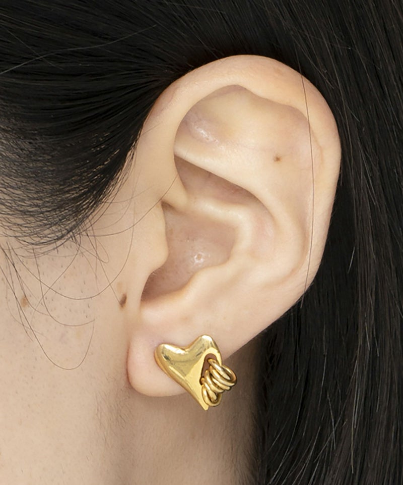 ニュアンス感のあるハートモチーフにコイルのアクセントがポイントのイヤリングです。 かわいらしくなりすぎないように、小ぶりサイズで厚みもおさえて使いやすいデザインに仕上げています。 同デザインのピアスタイプはこちら