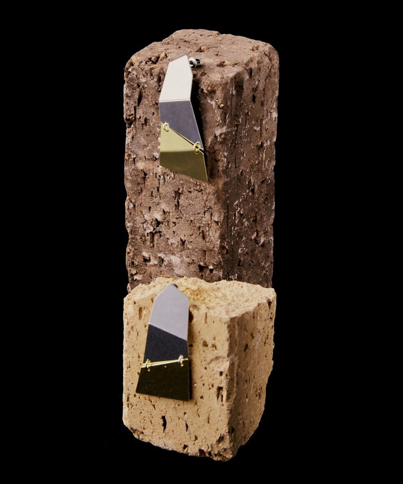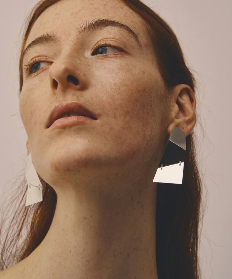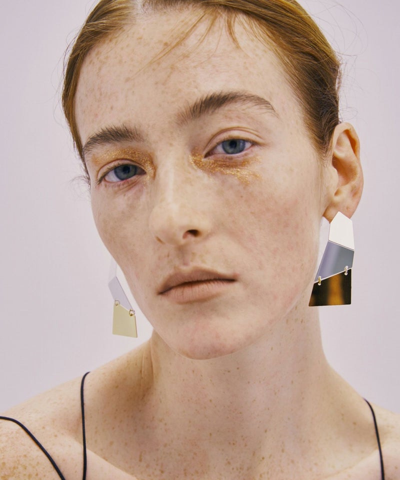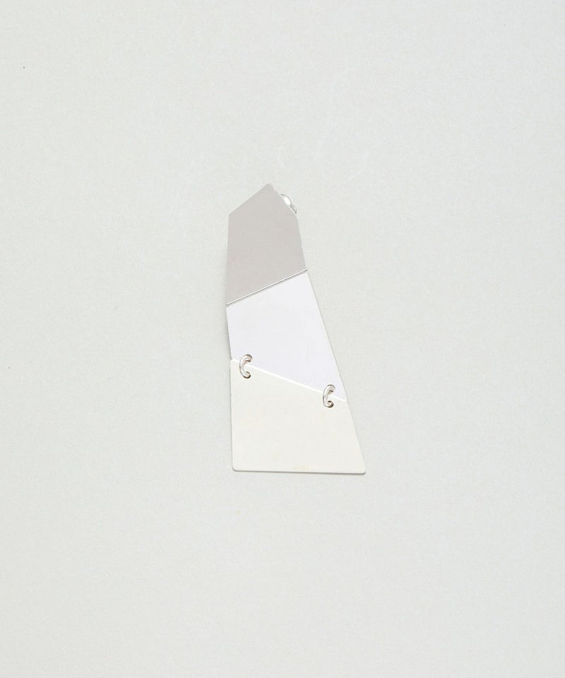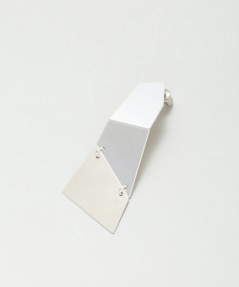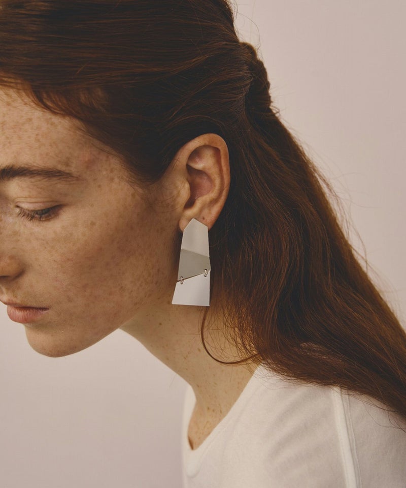メタルのプレートが繋がったPuzzleシリーズのピアス。 極薄の真鍮板から切り出して作成しているので、軽くて付けやすいのも魅力です。 折り紙のように折られ角度を付けたプレートは動くたびに光を反射し、耳元を印象的に見せてくれます。