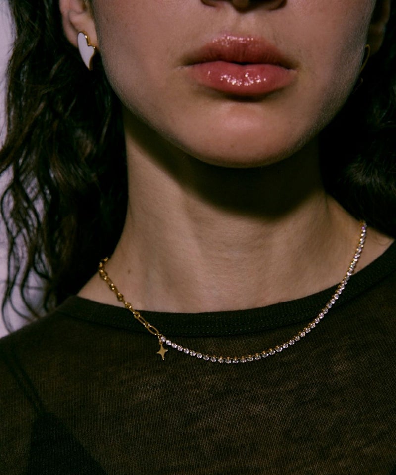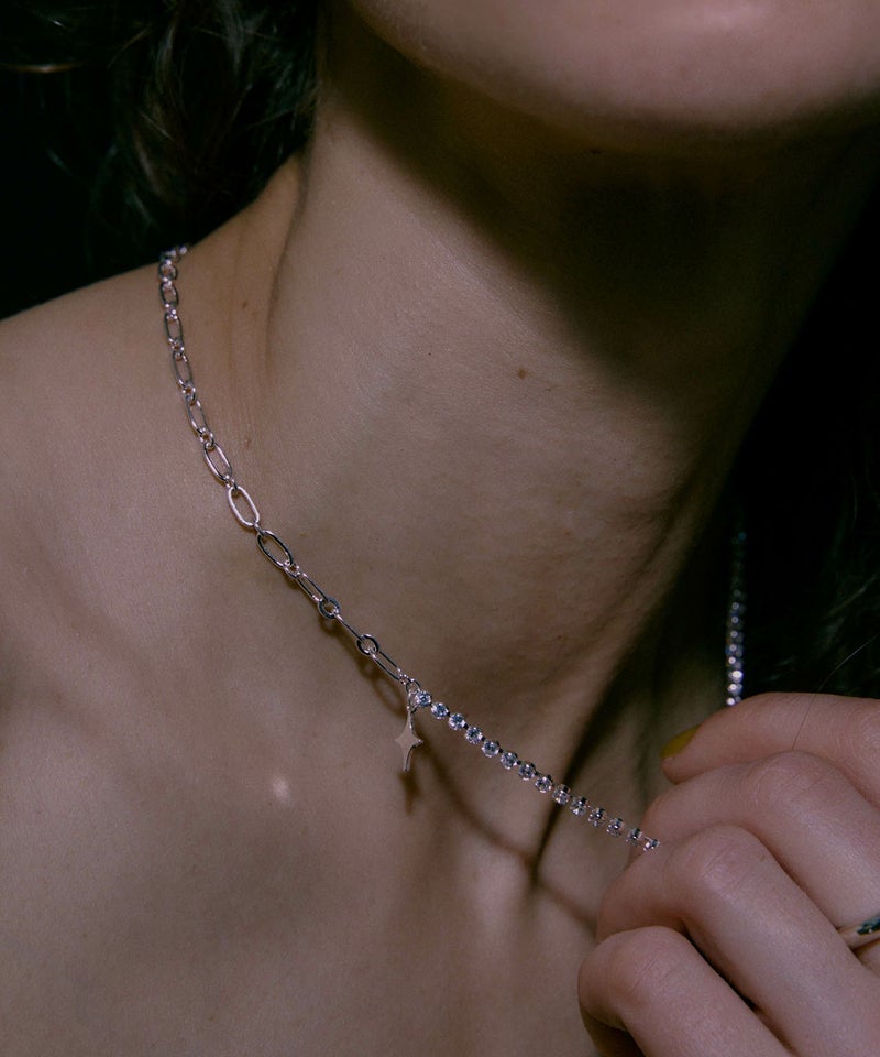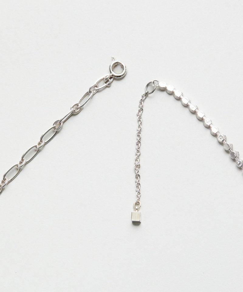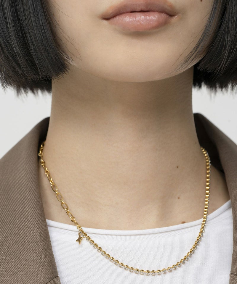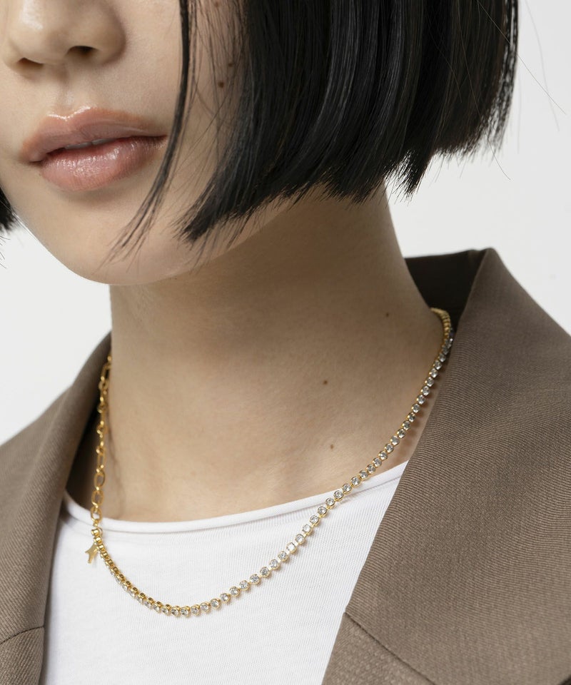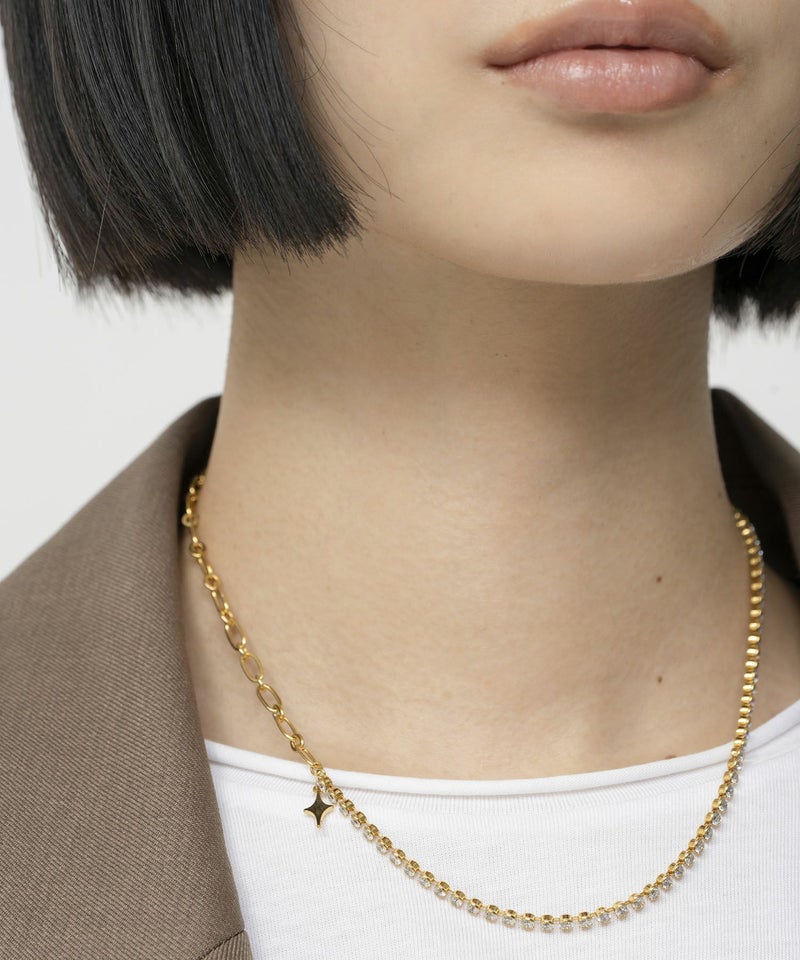 キラキラ揺れるオリジナルパーツをあしらった、Ornamentシリーズのネックレス。 左右アシンメトリーなデザインで、ビジューネックレスでもフェミニンになりすぎず、モードな雰囲気でお使いいただけます。 爪のないダイヤレーンを使用しているため、服への引っかかりが気になりにくく、着用しやすいのも魅力です。