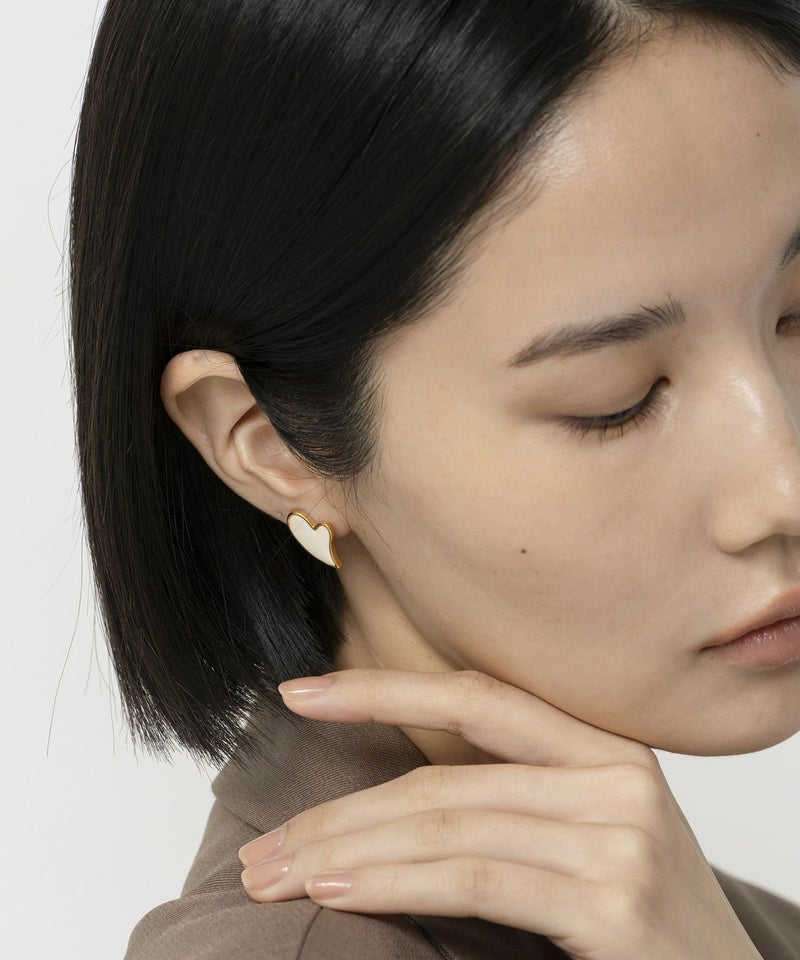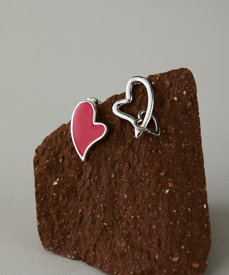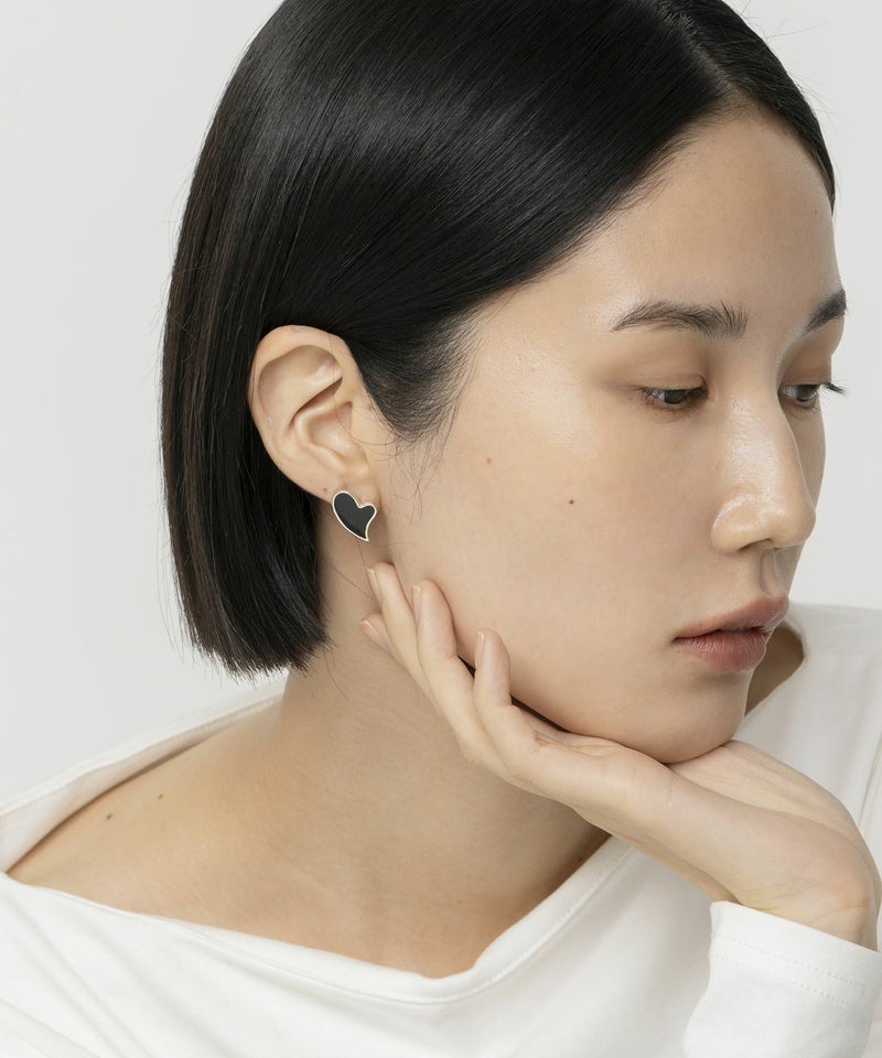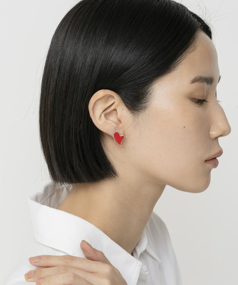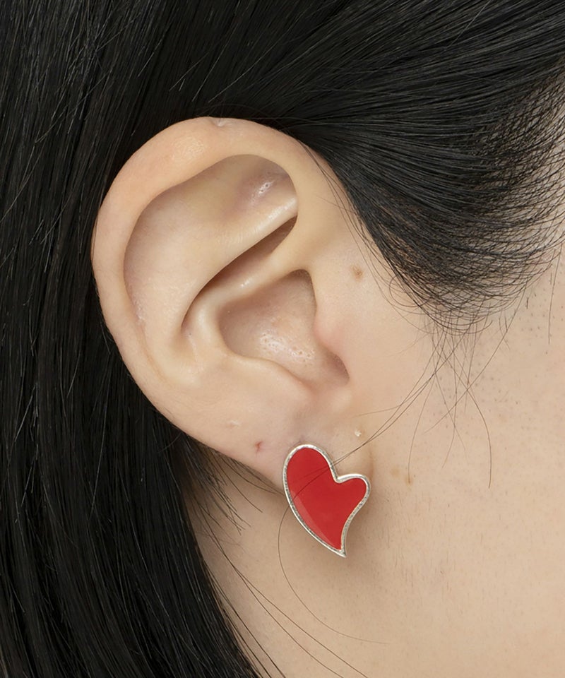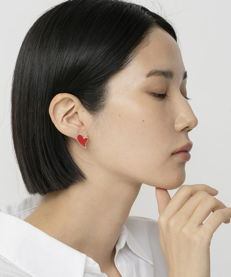 色々なハートの形を盛り込んだAmuseシリーズのピアス。 左右アシンメトリーなデザインがポイントで、一方のフレームには小さなハートパーツをON。 もう一方にはエポキシ樹脂をのせ、メタル素材の縁取りで仕上げています。 レッドはCASSELINI直営店だけの別注カラー。程よいサイジングで、さりげなく耳元を彩ります。