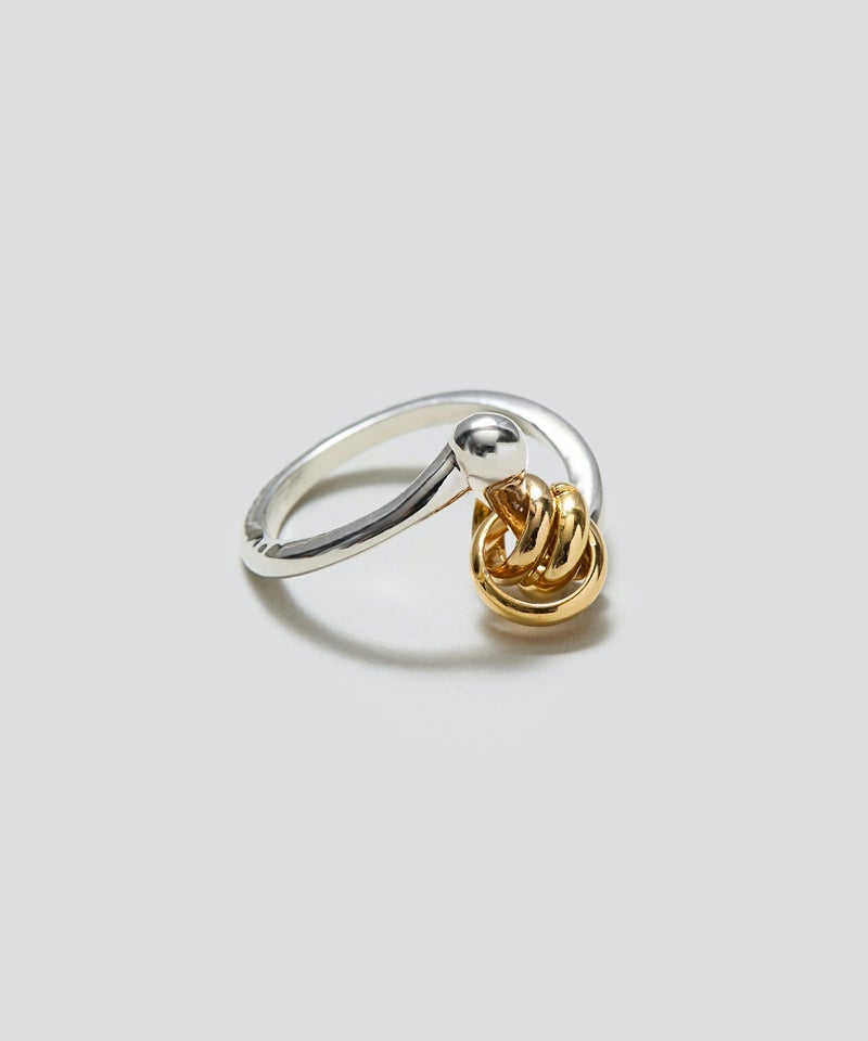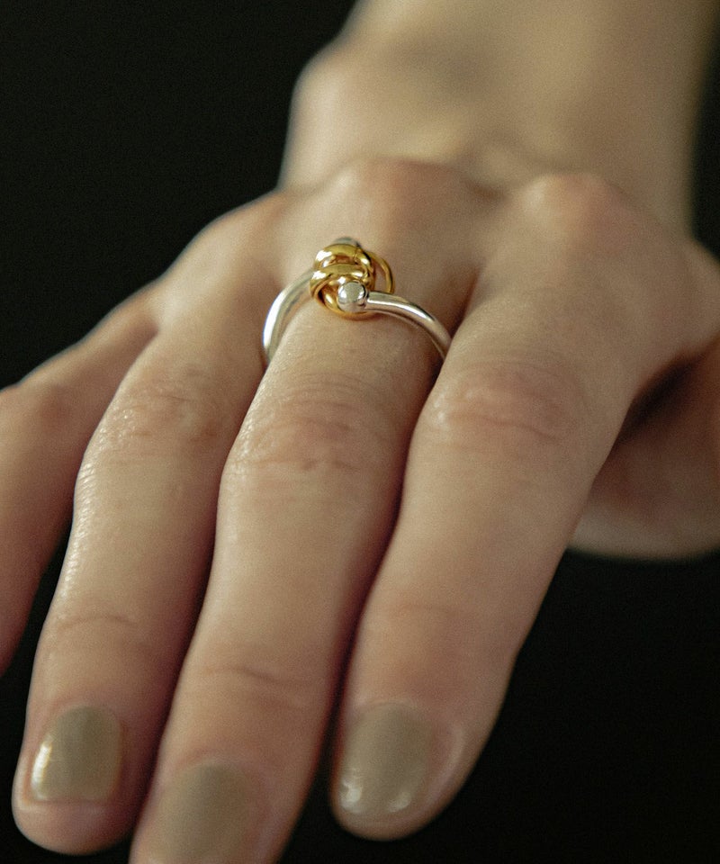 ニュアンスある形状にリングパーツをあしらった、Flow coilシリーズのリング。 フロントに縦型に配置されたパーツとジグザグにつながるリングが洗練された雰囲気を与えます。 細身の線形で作成しているので、手元に取り入れやすいボリュームです。