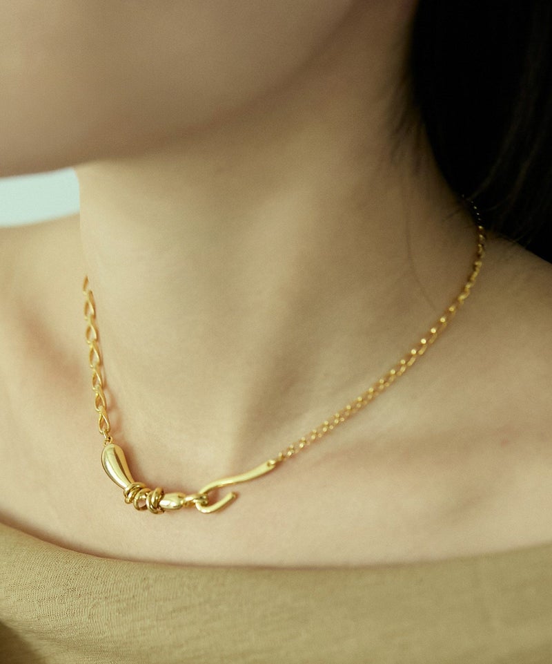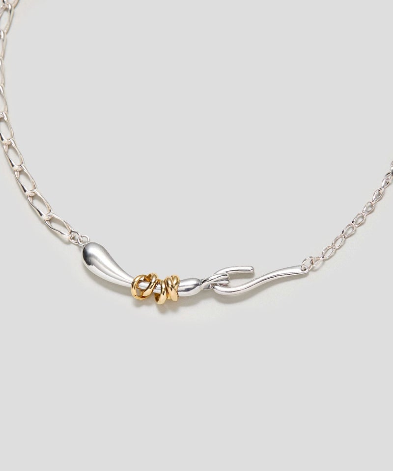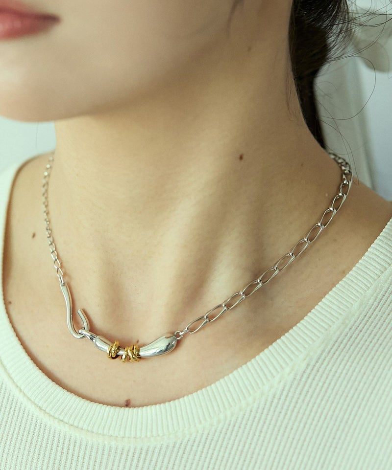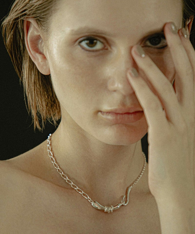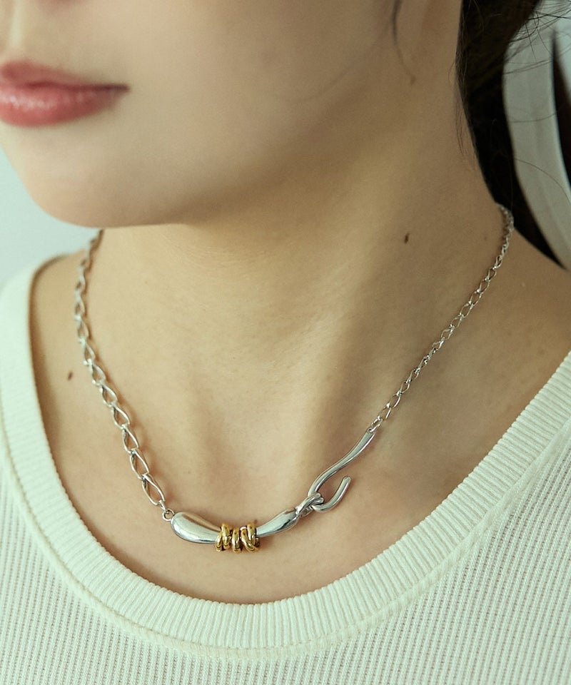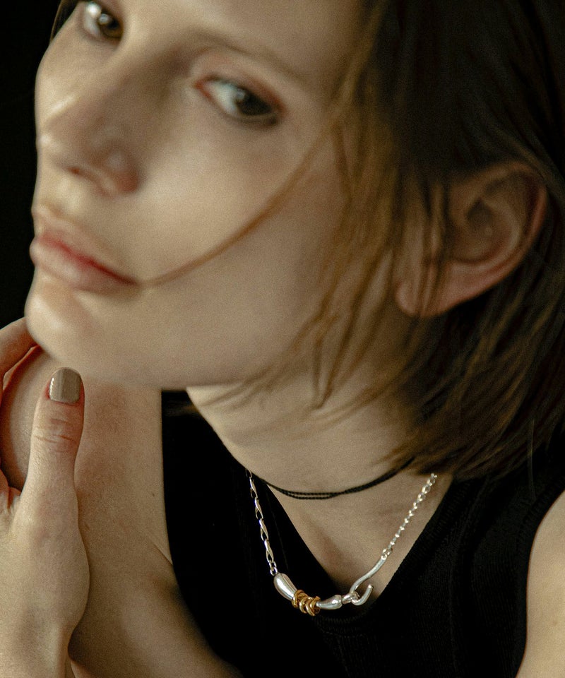 ニュアンスある形状にリングパーツをあしらった、Flow coilシリーズのチョーカー。 二種のチェーンで構成された表情のある作りで、オリジナルの留め具も引っかけタイプにしており、デザインの一部になっています。 スタイリングにプラスするだけで、トレンド感のあるスタイルが完成します。