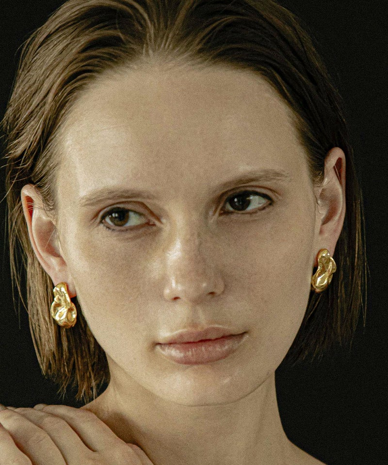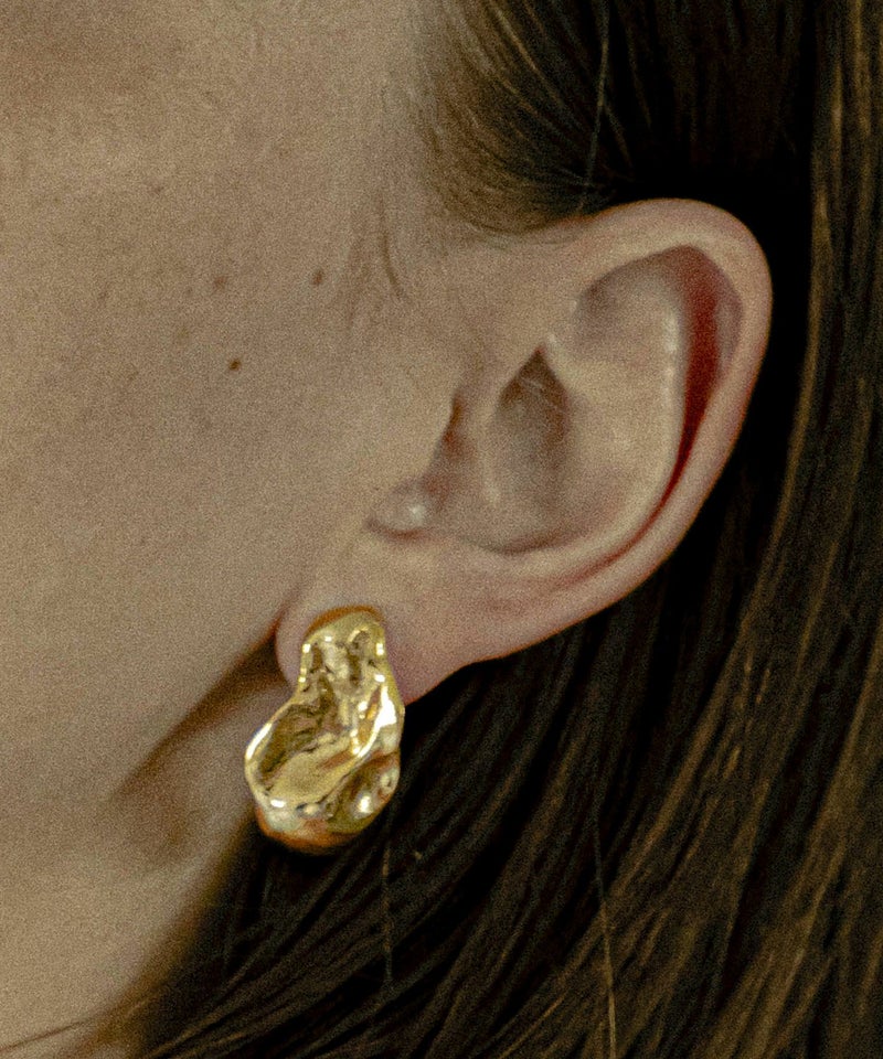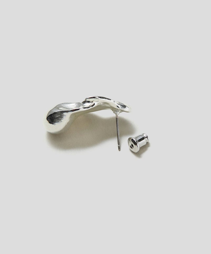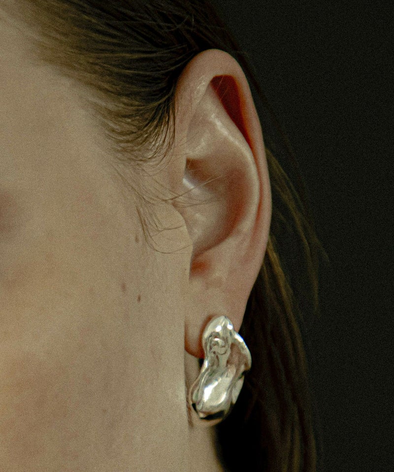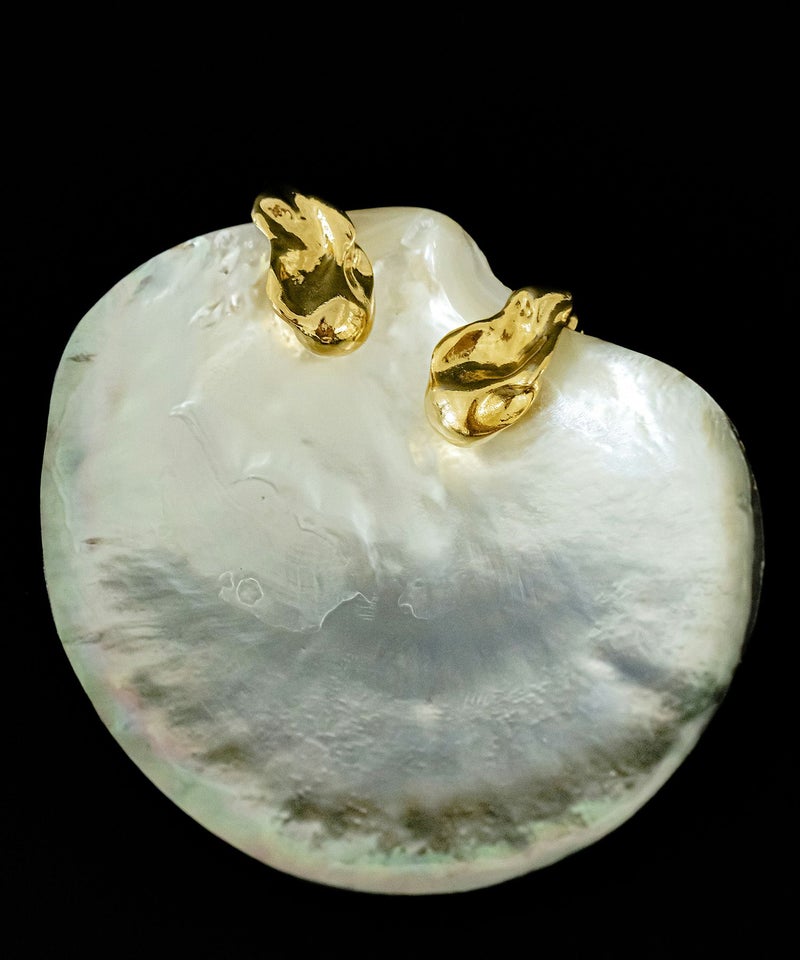 Oysterを両耳にあしらったピアス。 横から見た時のシルエットもきれいに見えるよう、耳に沿う、少しアールをかけた形状もポイント。 ニュアンスのあるシルエットと存在感で、顔回りにモードな雰囲気をプラスします。