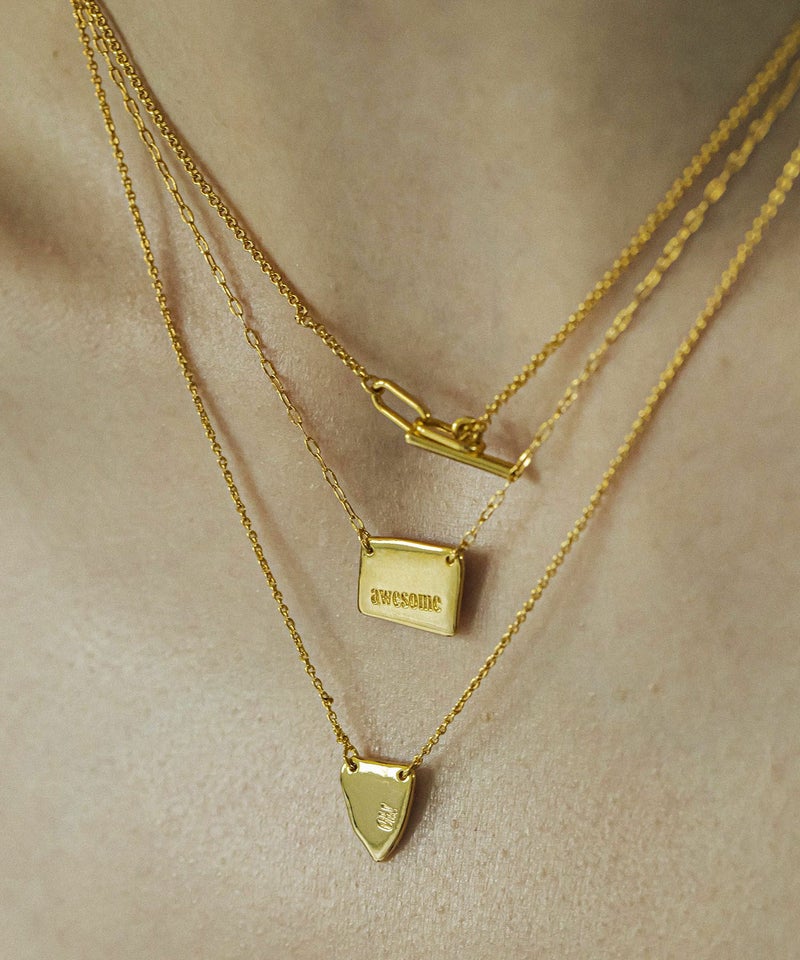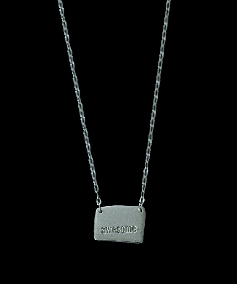 “Awesome”のロゴが刻まれたプレートネックレス。 少し歪な形状のスクエアプレートに、ロゴも傾きをつけて刻んで、遊び心をプラスしています。 「Oh necklace」との重ね付けもおすすめ。単品使いでも重ね付けでも使いやすい一品です。