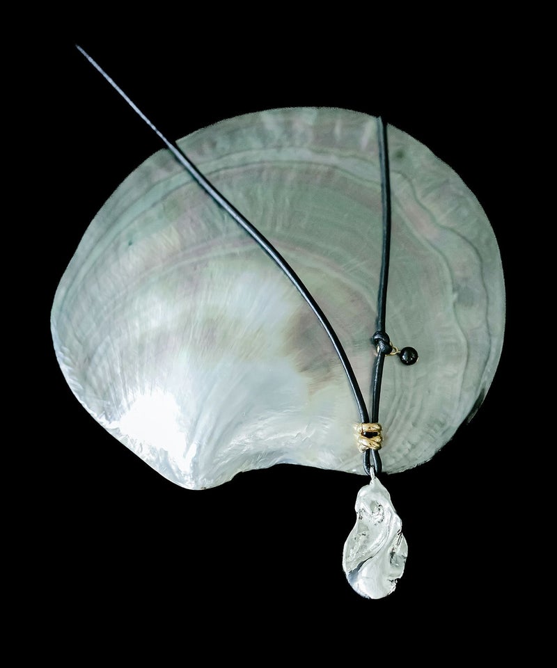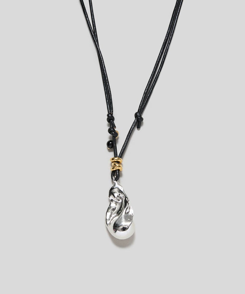 レザーコードを使用した、Oysterシリーズのネックレス。 片側にあしらったオニキスのさりげないアクセントと、Oysterに被せたCoilパーツが印象的。 かぶりタイプで気軽に着け外しでき、長さも自由に変えられる使いやすさもポイントです。 プレーンなTシャツに合わせた、シンプルなスタイリングもおすすめ。