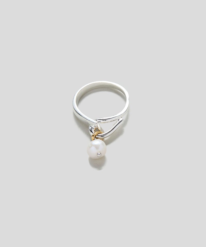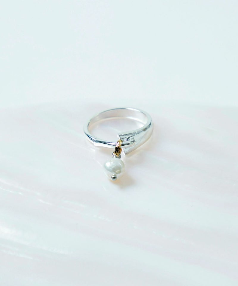 アシンメトリーで立体感あるデザインの淡水パールリング。 小粒のパールが揺れる印象的なルックスで、手元にアクセントをプラス。 パールにありがちなコンサバ感を感じさせない仕上がりになっています。