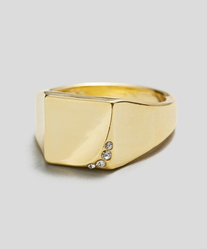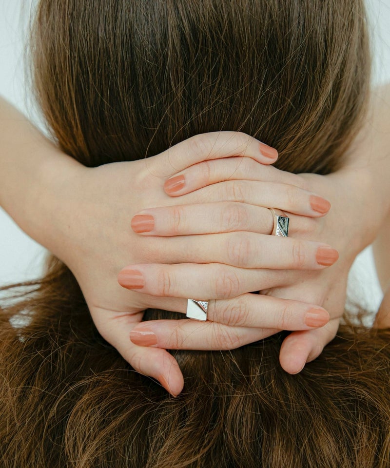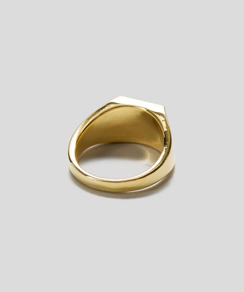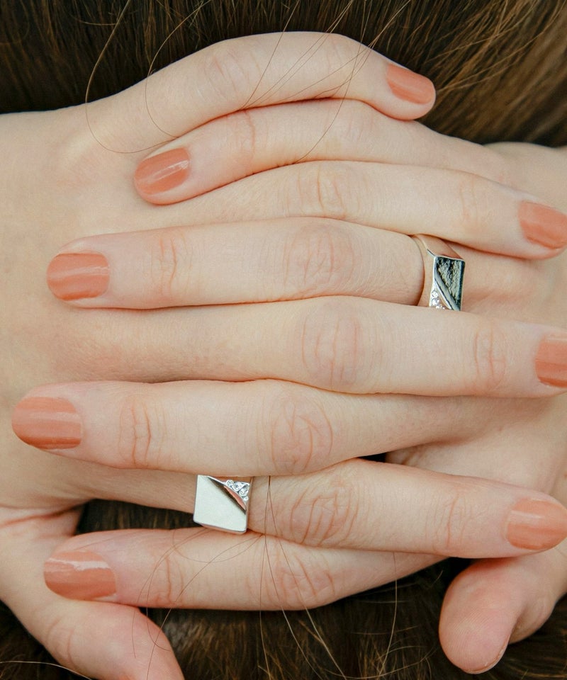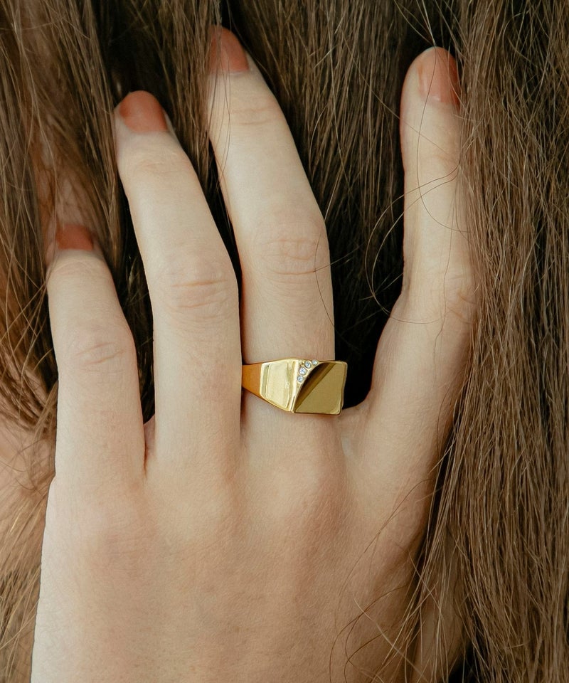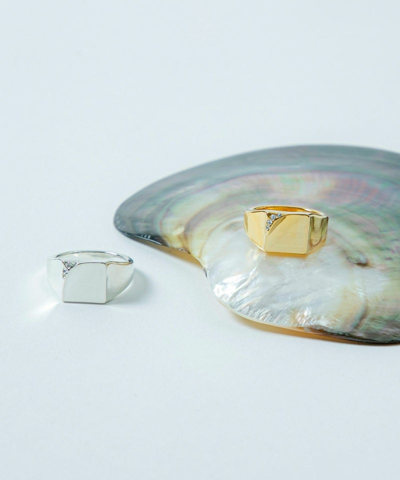 デイリーに使いやすいシンプルなシグネットリング。 ニュアンスのある表面の凹凸と、角部分に配置されたスワロフスキーが印象的。 手元にクラス感を与えてくれるデザインです。