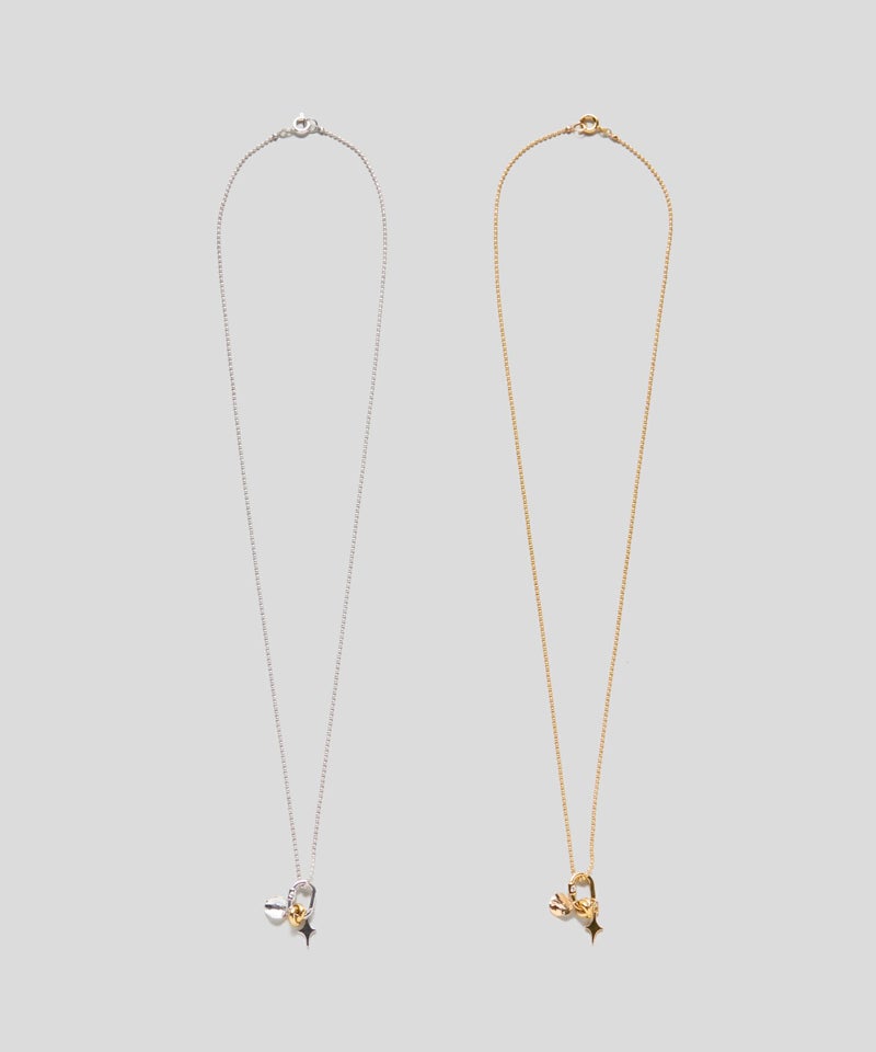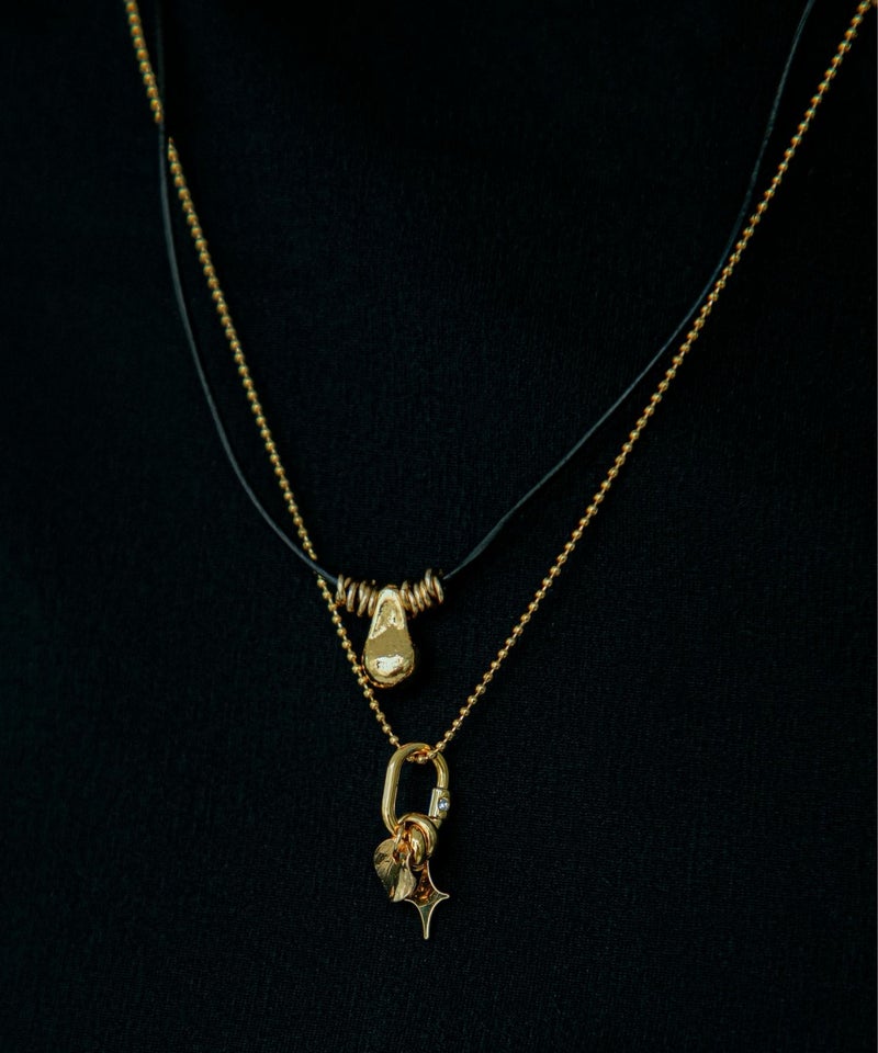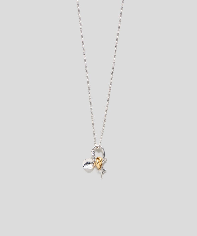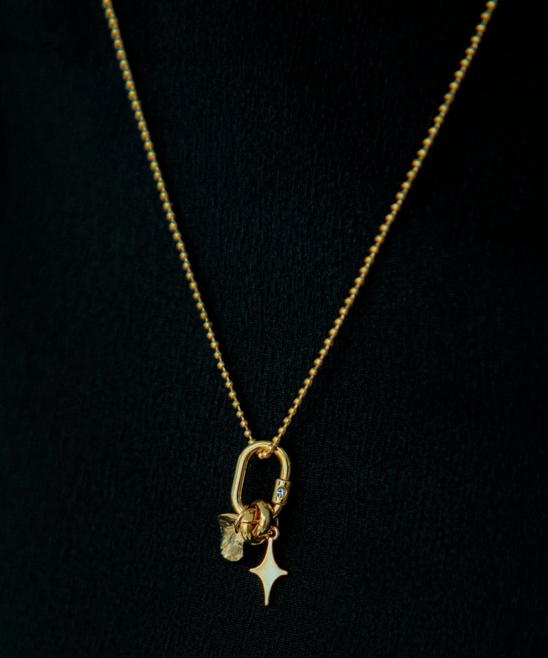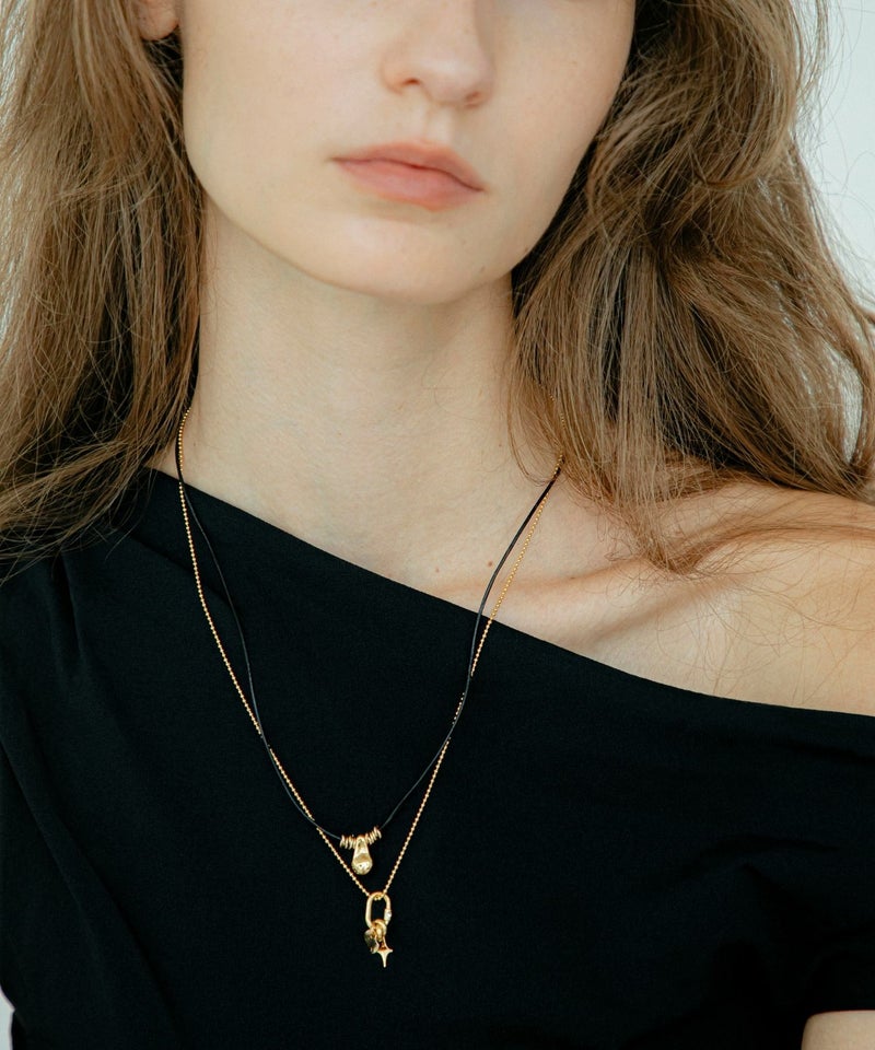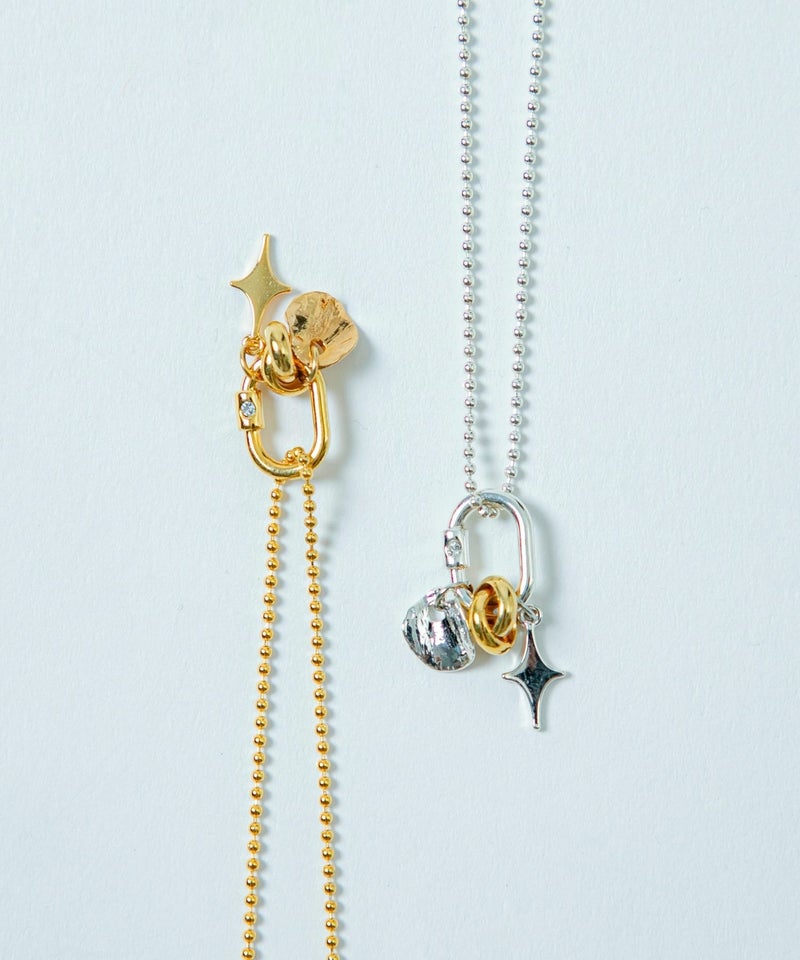 スワロフキーが付いたリングパーツに、プレートチャーム、コイル、オーナメントパーツをあわせた、トレンド感あるデザインのネックレス。 細めのボールチェーンでジュエリーライクな雰囲気に仕上げています。 じゃらっとしたチャーム使いが、大人のキャッチーなポイントアクセサリーとして活躍。 重ね付けもおすすめです。