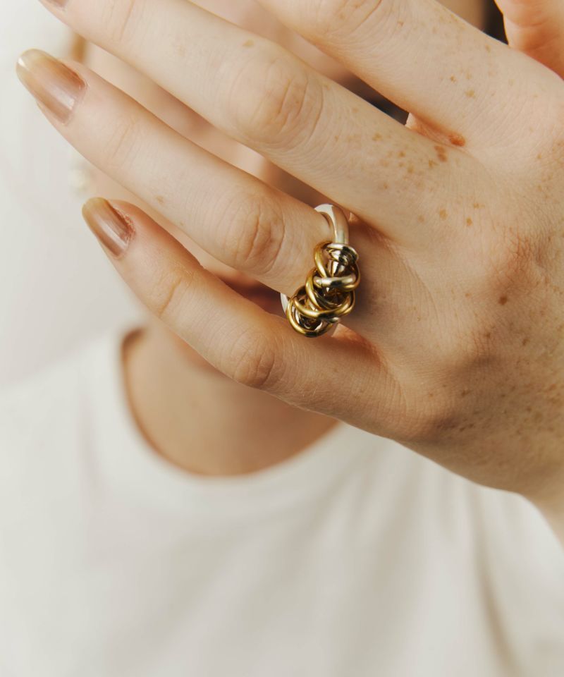シンプルなリングなので、どんなコーディネートにもマッチし毎日でも付けられるアイテム。一見じゃらじゃらとしたデザインですが、フープに通されたコイルは固定されており手元で邪魔になりません。重みもなく、ストレスフリーで着けていただけるリングです。同じデザインのピアスやイヤカフと組み合わせて着けていただくのがおすすめです。