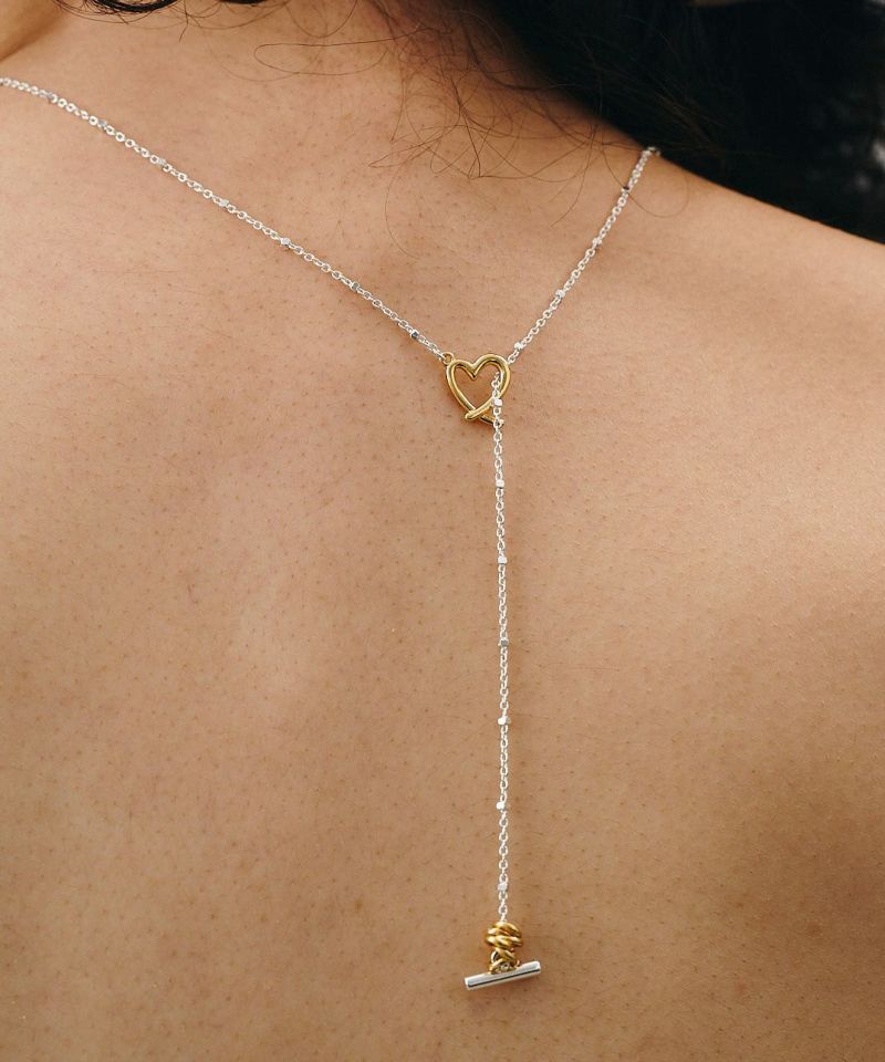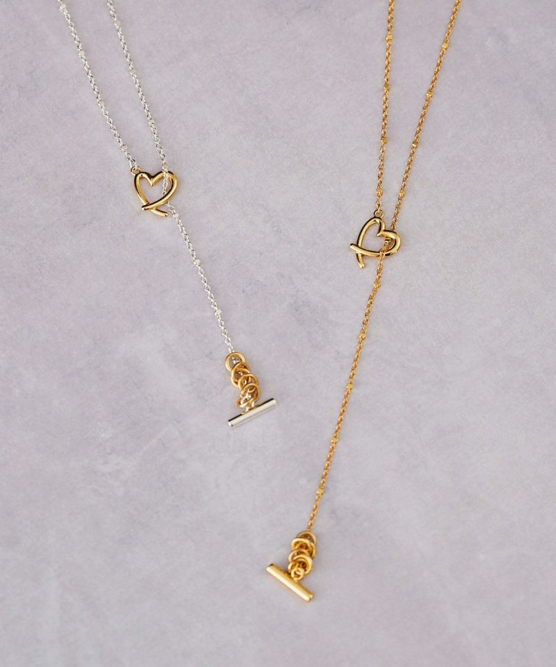 オープンハートのパーツを使用したマンテルタイプのネックレス。 Coil部分は移動させて使用出来ますので、色々な位置にもってきてアレンジして使うことが可能です。 すっきりとしたY字のシルエットがスタイリッシュさを演出してくれます。