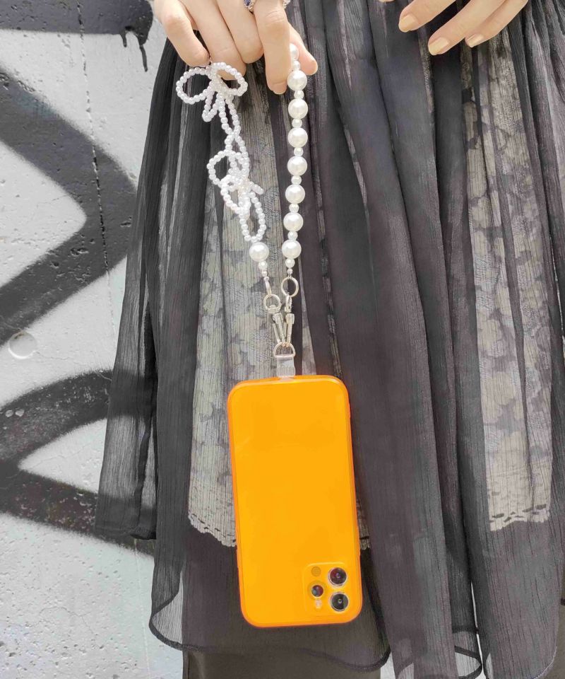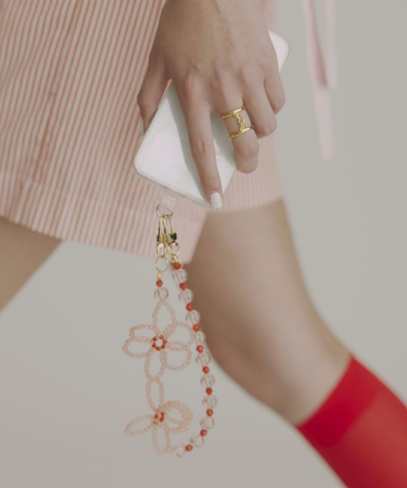 お花型に編んだビーズが可愛い、存在感のあるルックスで、手首に通すだけでワンポイントになるアイテム。 両手がふさがらずいつでもサッとスマホが操作が可能に。