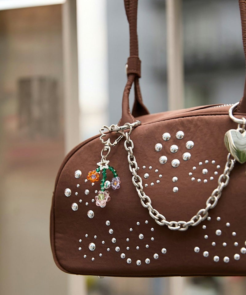 カラビナで取り外し可能なチェーンチャームはぷっくりしたハートモチーフがポイント。