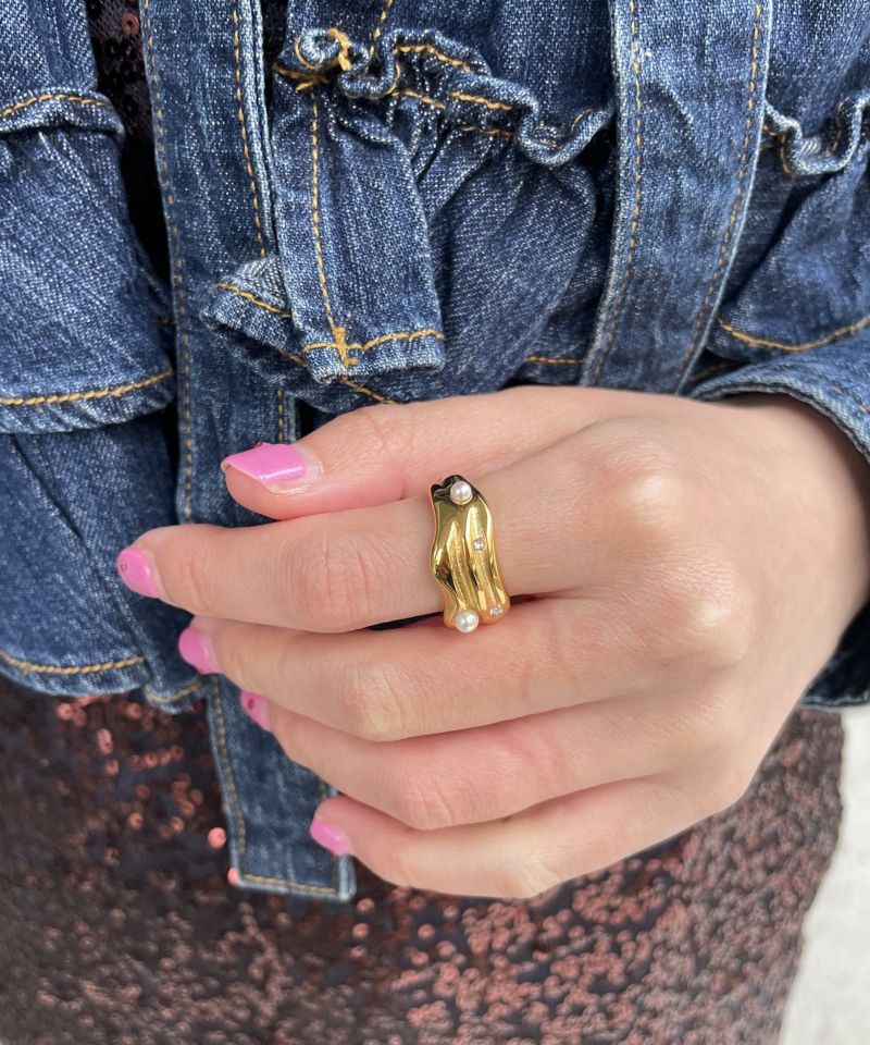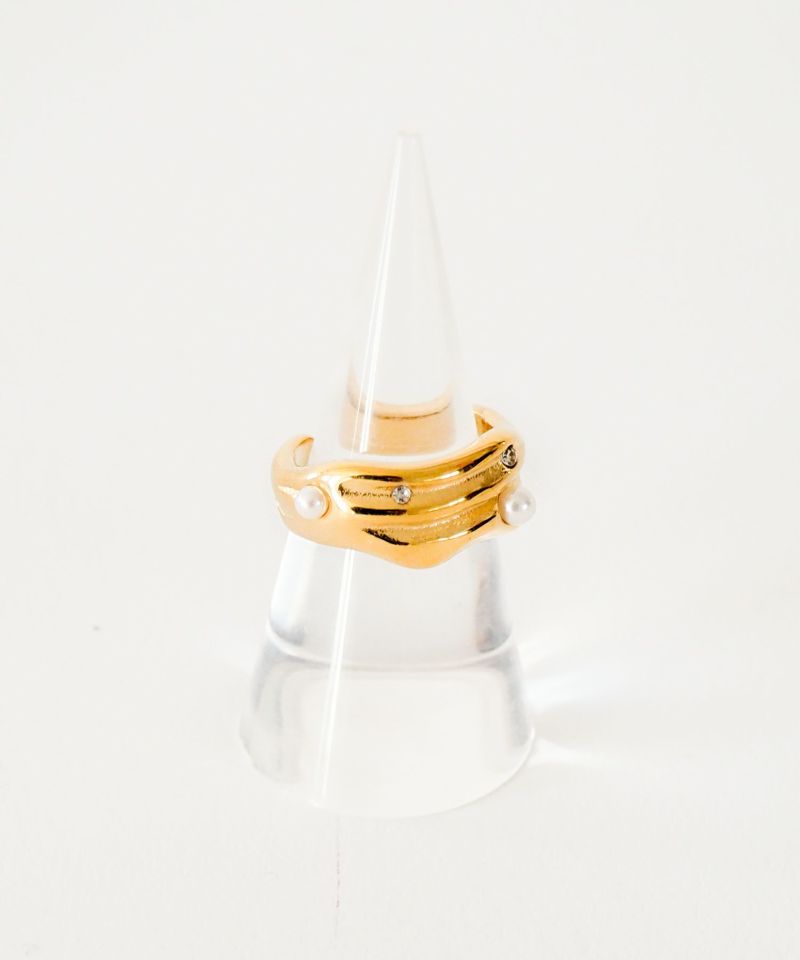 繊細なパールビーズがついた、綺麗めにもカジュアルにも使いやすいリング。 太めのリングが、しっかりと存在感がありつつも上品な印象に♪ 単品使いではもちろん、お手持ちのアクセサリーと組み合わせての使用もオススメです。