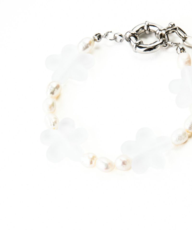 マットなフラワービーズとパール風ビーズが、手元に華やかさと可憐なニュアンスをプラス。 絶妙なサイズ感で、単品使いはもちろん、重ね付けにも映えるデザインです。 ネックレスとセットで合わせれば、より統一感のあるスタイリングが楽しめます。
