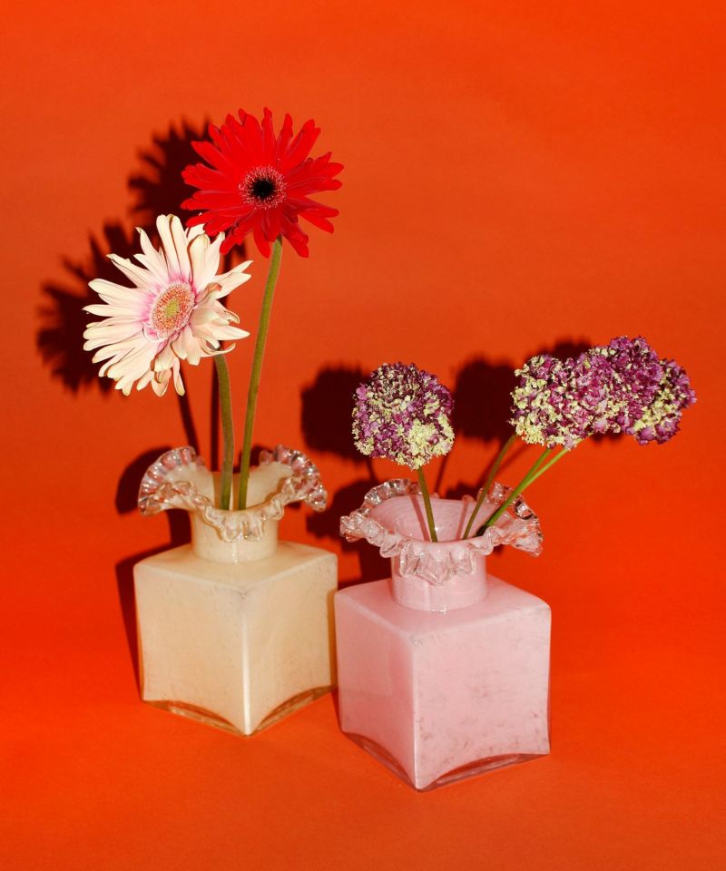 四角いフォルムが可愛らしくレトロな雰囲気を漂わせるガラスの花瓶。