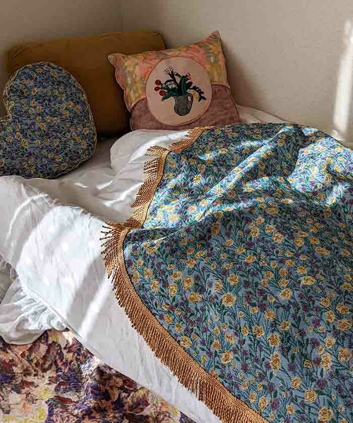 高級感のあるジャガードにキャセリーニらしい配色のフリンジを組み合わせ、とにかく「かわいい」を追求したアイテムです。さっと敷くだけでお部屋を一気に垢抜けさせてくれること間違いなし。