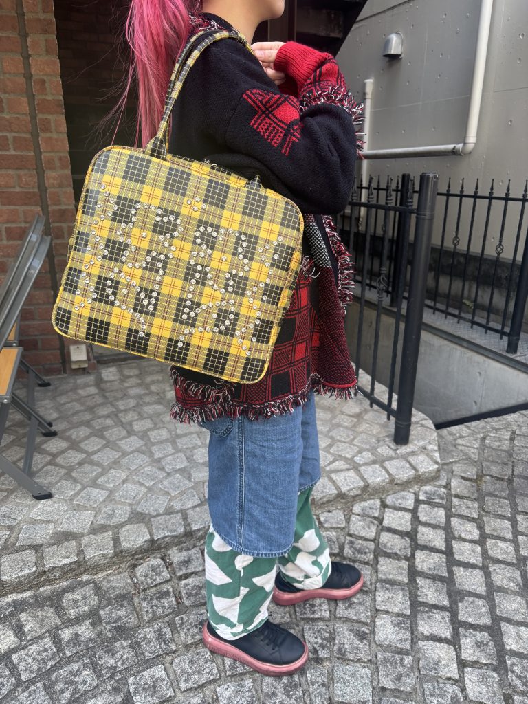 荷物がしっかり入るボストンバッグ。 オモテ面に、カシメで留められたラインストーンで絵をかきました。 何だか分かりますか?花柄なんです。 内側にはポケットが2つ。1つは大きめでクッション性のあるipad用のポケットになっています。 少しだけハンドルを長めにしているので、肩掛けしやすいです。