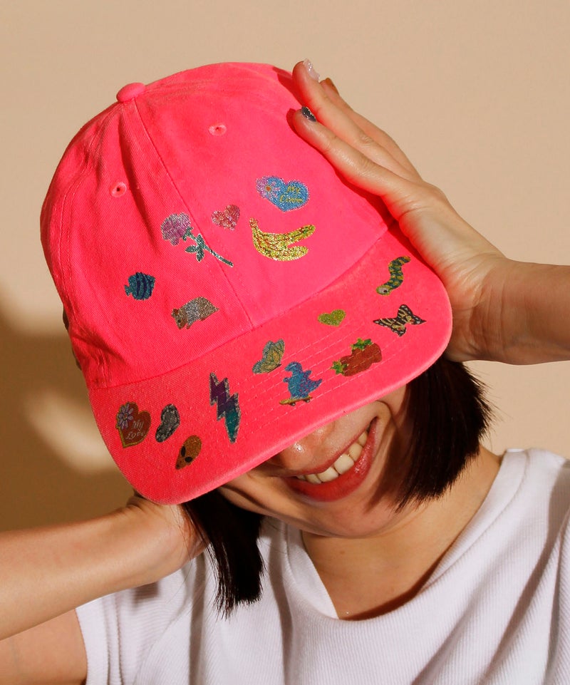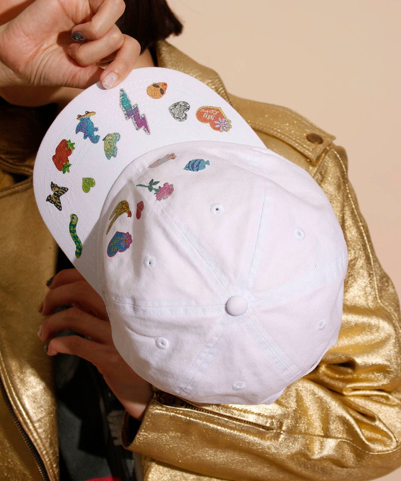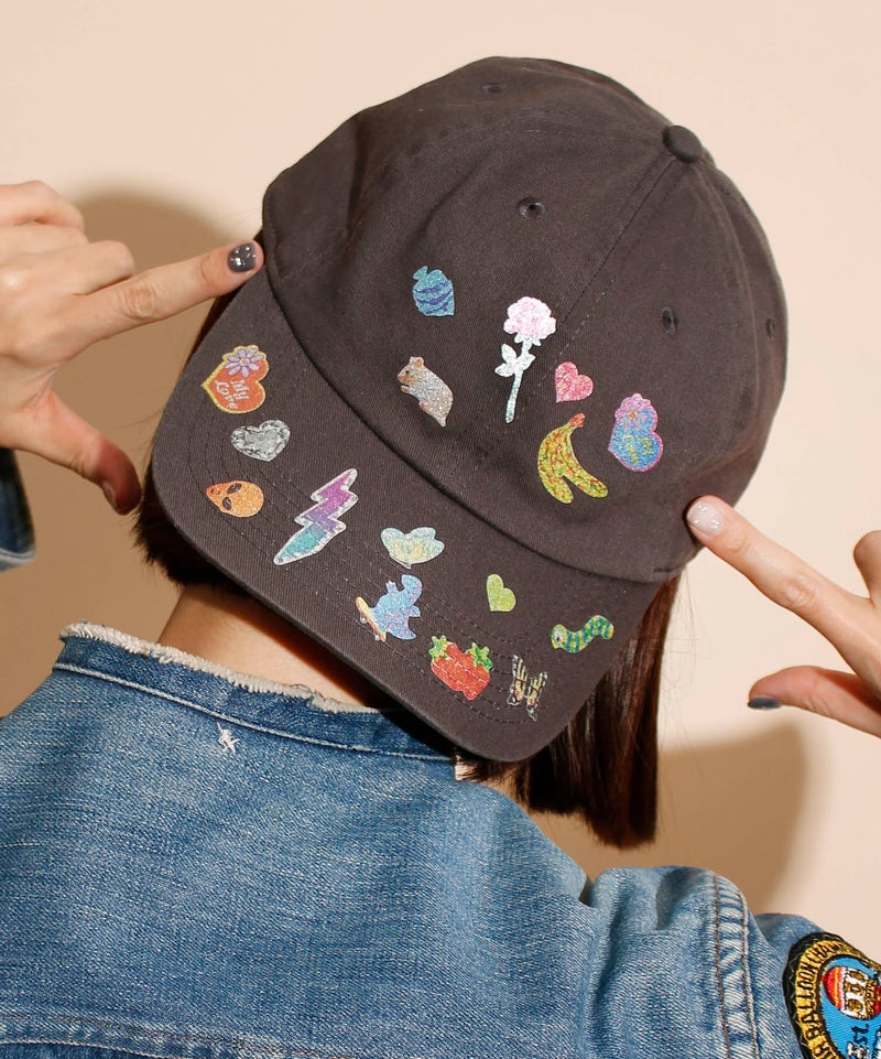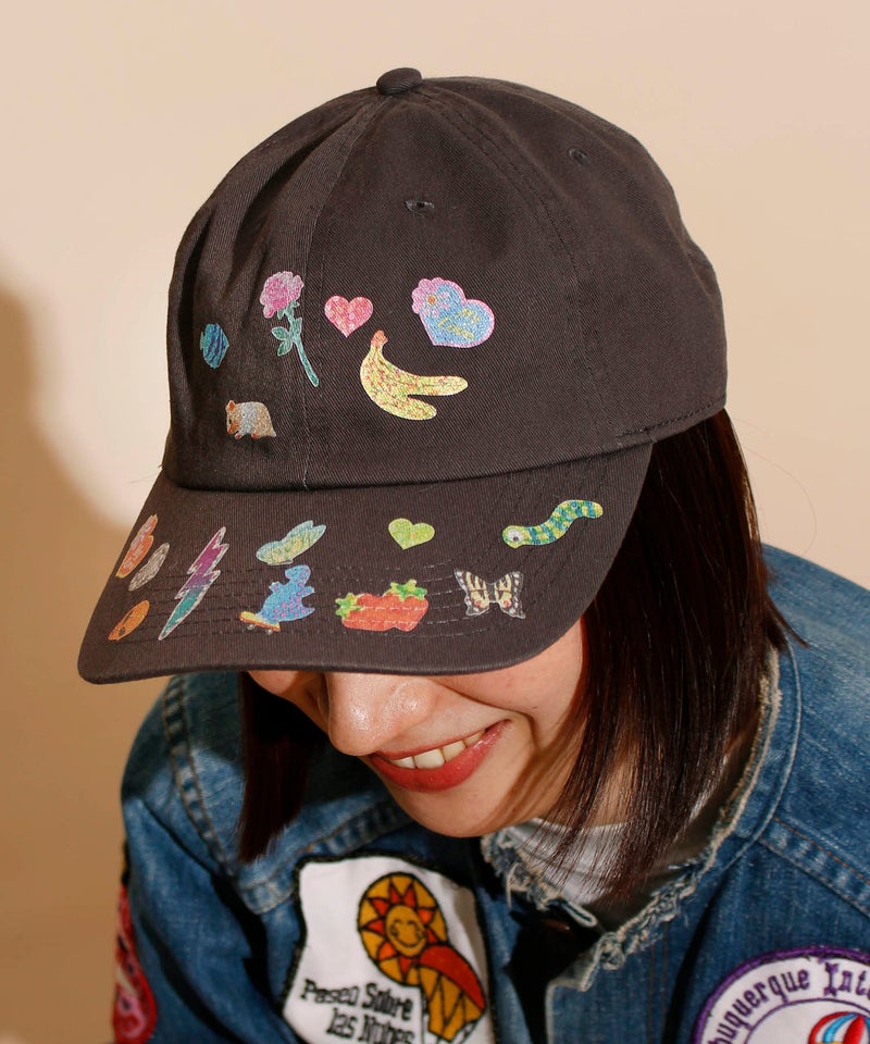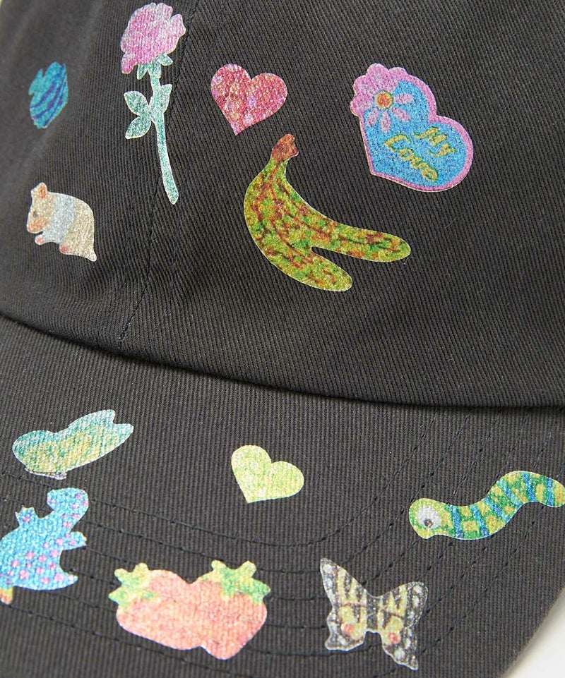 誰かのいたずらで目を離したすきに貼られちゃったよ~みたいなシールのグラフィックが楽しいキャップ。