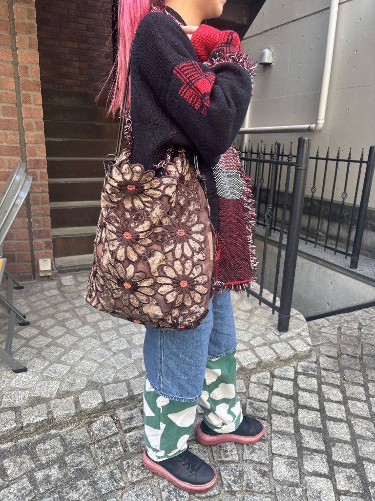 大きなフラワーモチーフのワッペンをパッチワークした、インパクト大のトートバッグ。