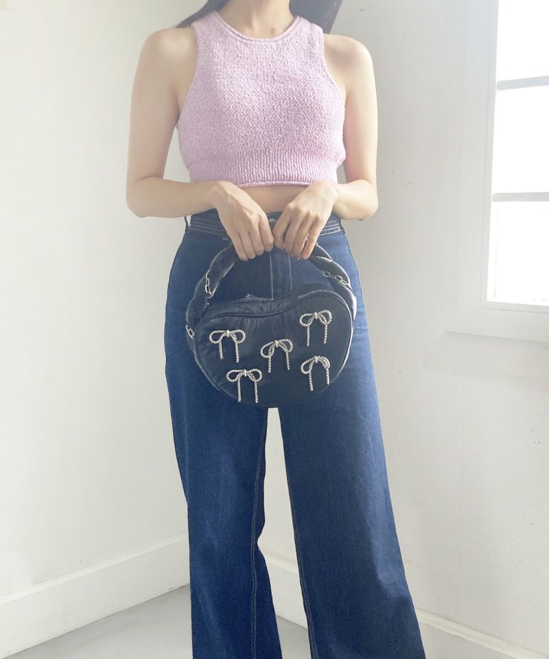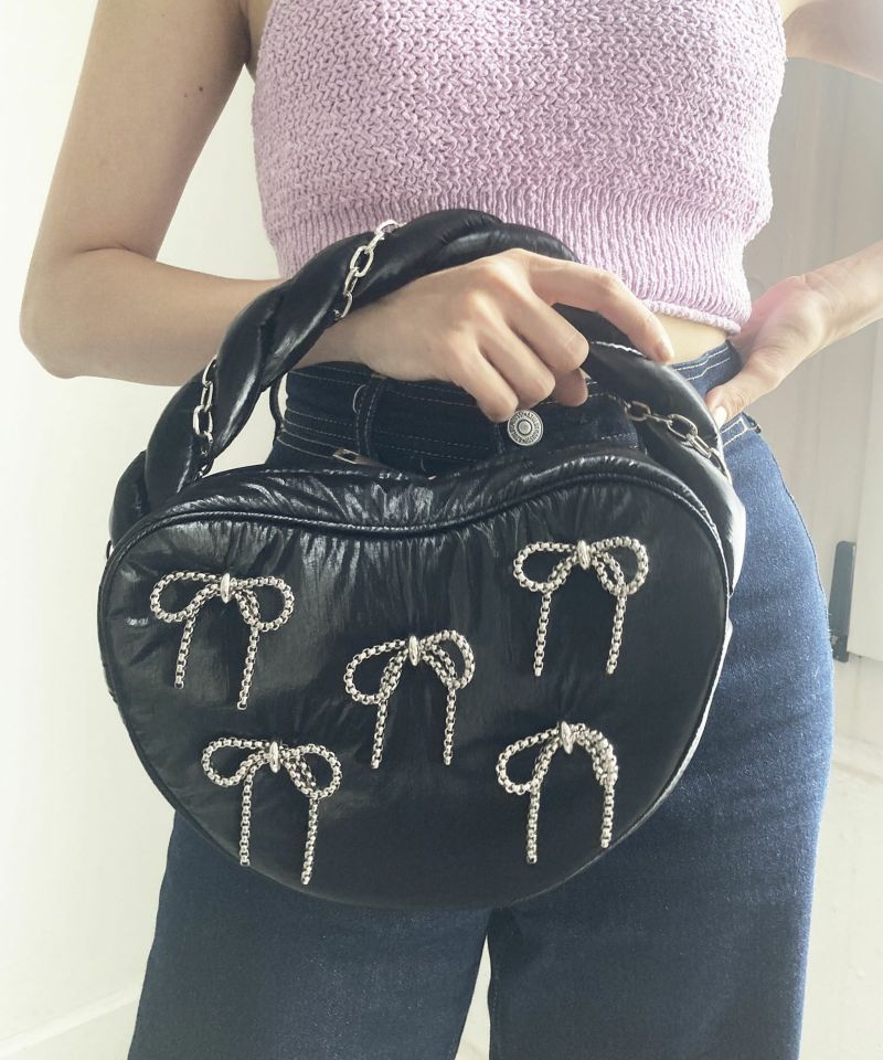 たくさんのチェーンリボンと、ねじねじとチェーンを巻き付けた持ち手がキャッチーなハンドバッグ。 歩くたびに一緒に揺れるリボンと、甘くなりすぎないハートのシルエットがキュートなアイテムです! コンパクトな見た目ながらマチがしっかりあるので、お財布やスマホ・ポーチなど必要なアイテムはしっかり収納できるサイズ感です。