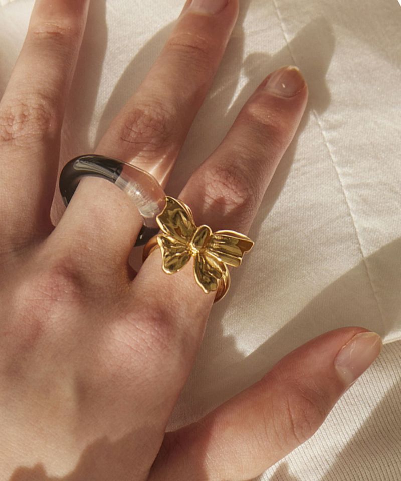 リボンモチーフが可愛いリング。 立体的なデザインが手元を華やかに見せてくれること間違いなし。 程よいボリューム感で手元にアクセントを添えてくれます。