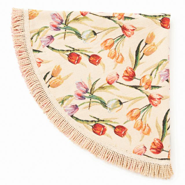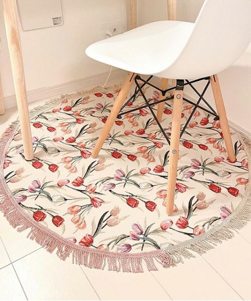 ワークデスクとイスの下に敷いてラグとして使用しています。 チューリップ柄の色味は渋くなく、フリンジは光沢感があってとても可愛いです! 滑り止めは付いておらず、イスを動かすたびにラグも動いてしまうので、滑り止めシートなどで対策しようと思います。