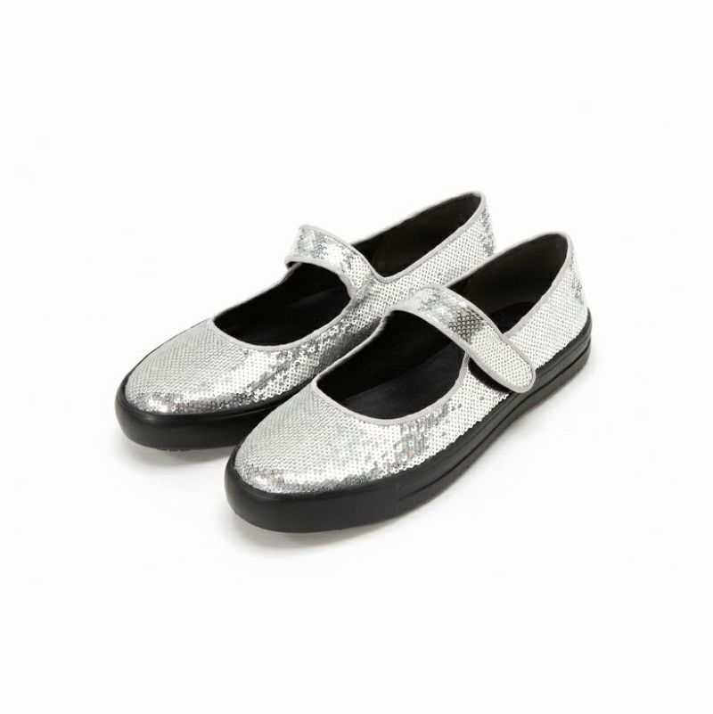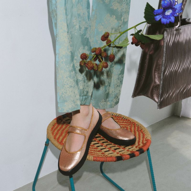 キラキラしすぎずマットなスパンコールで、大人履けるアイテムに仕上げています。