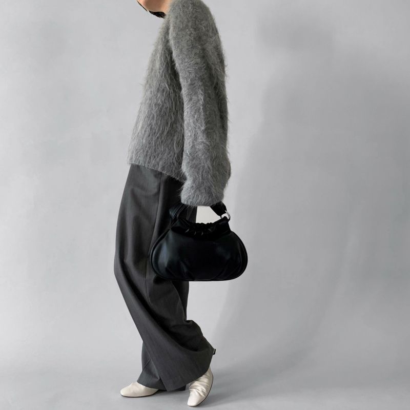 片側巾着仕様のクラッチにも使え、カラビナを取り付けることでminiハンドルバッグに変化する、ふっくらして可愛いぷくぷくバッグです。