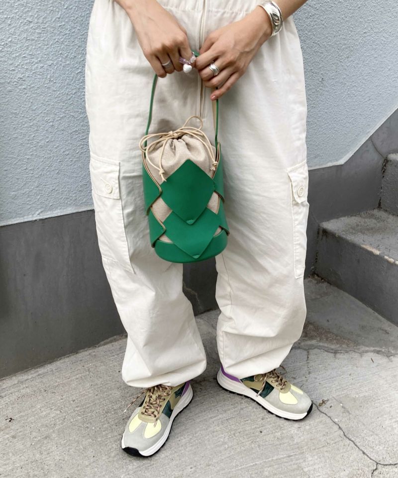 甘くなりすぎないようあえてフェイクレザー素材で平面的なモチーフを表しており、可愛すぎない、シャープすぎない、程よい感覚のバッグ。