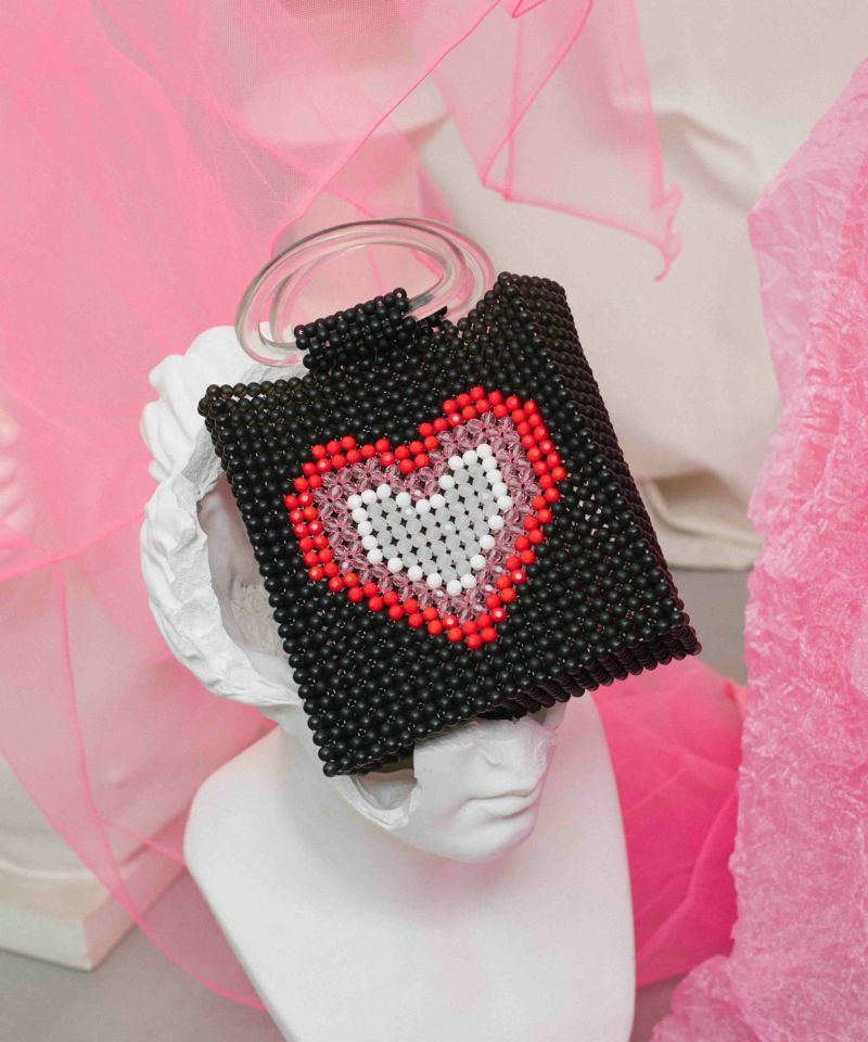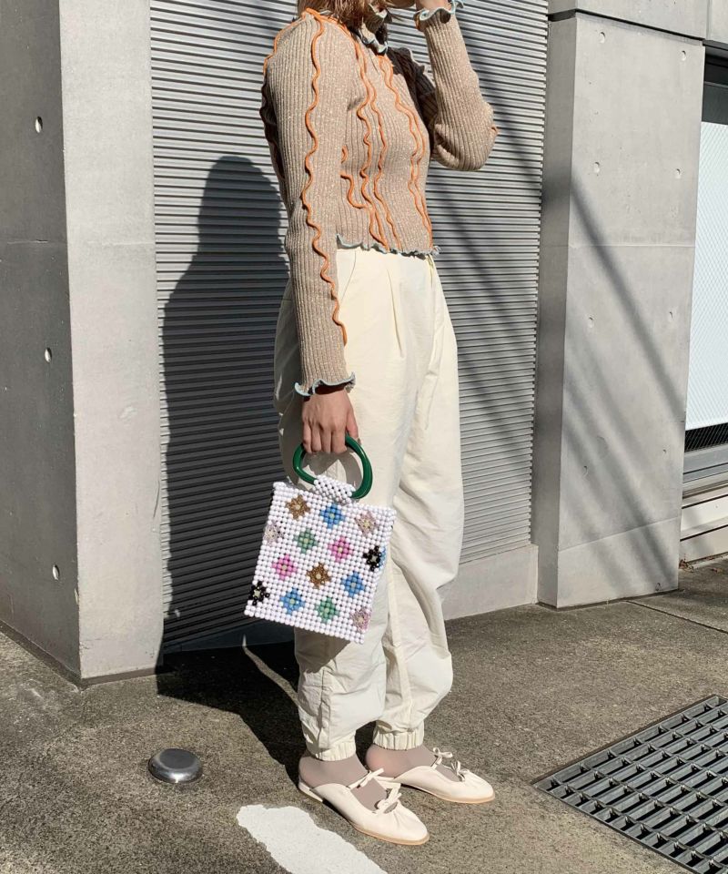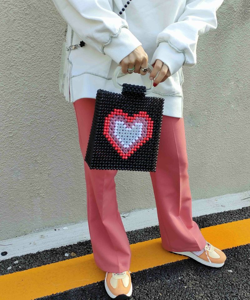 ベースカラーは白や黒をもちいてるので、可愛さの中にも合わせやすさも兼ね備えたアイテム。自立する程のマチがあるため、スマホやお財布、ハンカチやイヤホンなど、必要なアイテムはばっちり入ります!