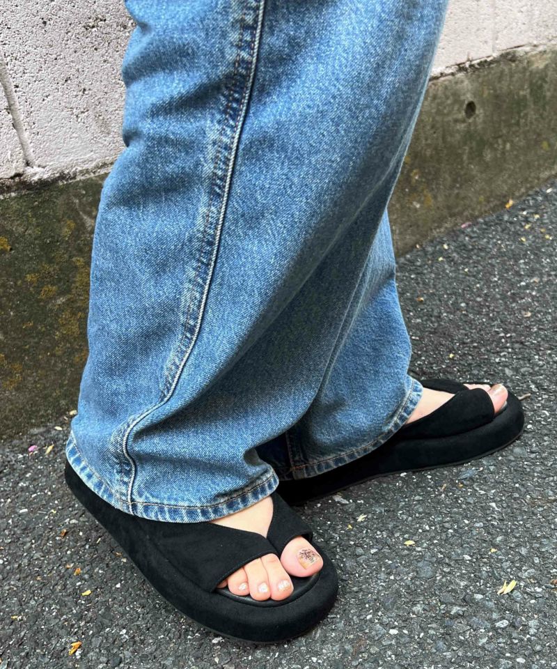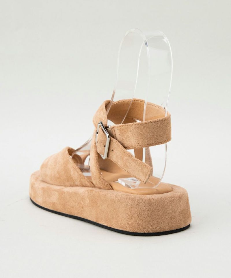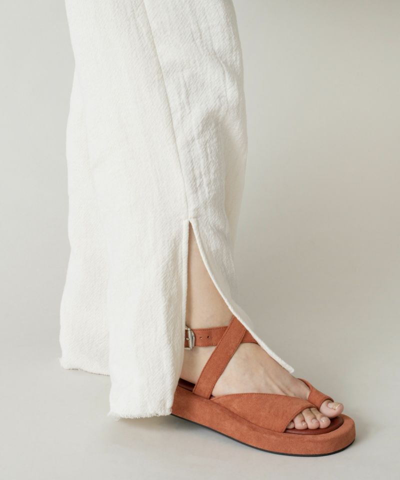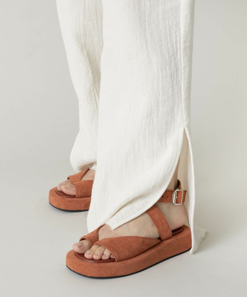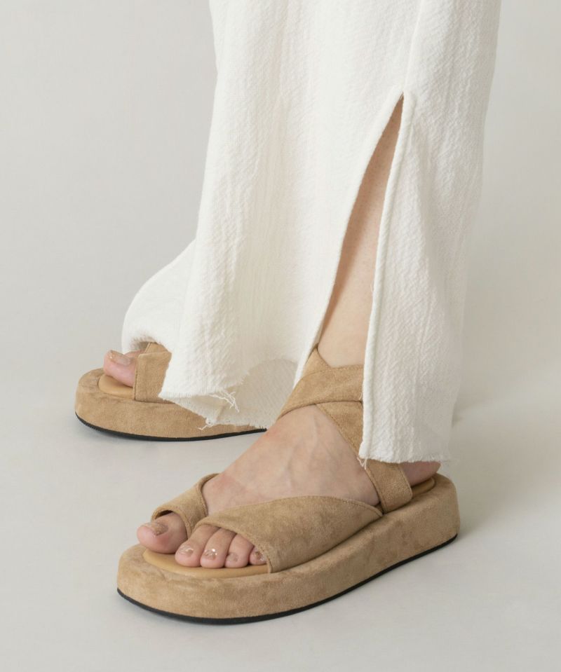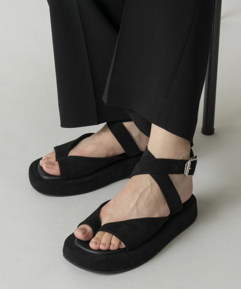 プラットフォームソールと足首をぐるっとつつみこむワイドベルトが足元をスリムに魅せてくれるサンダル。