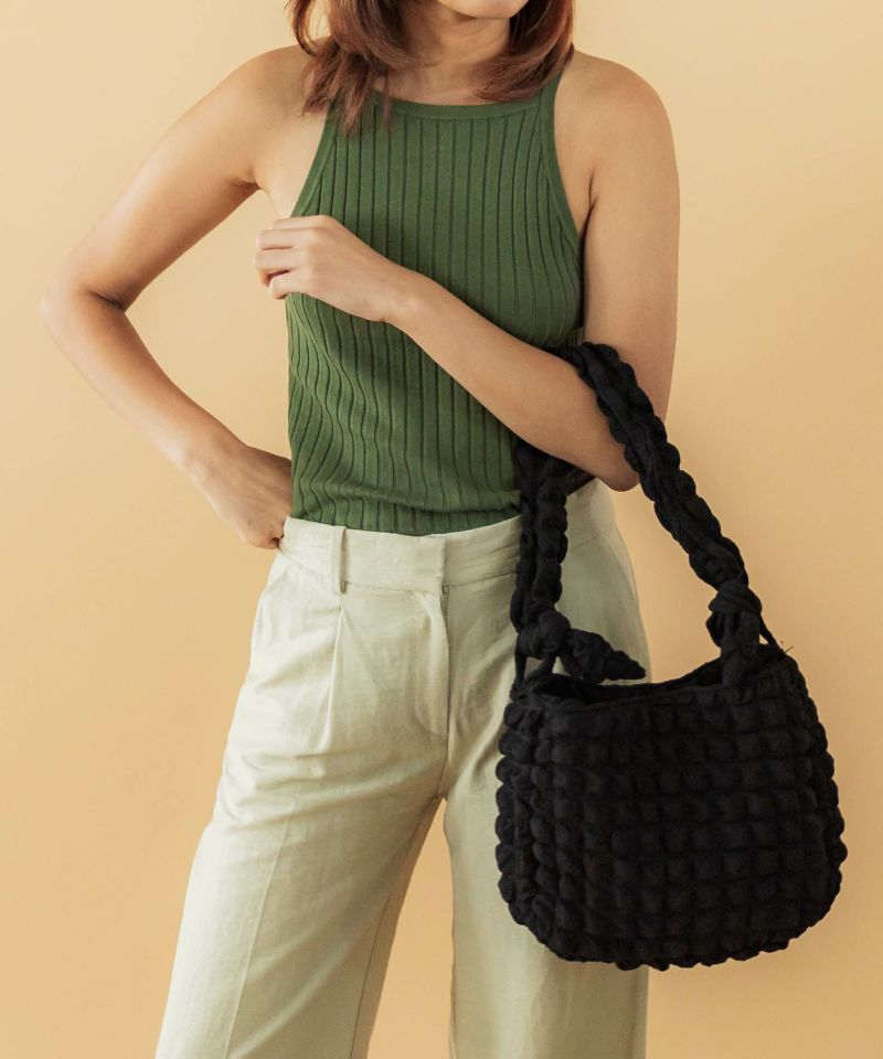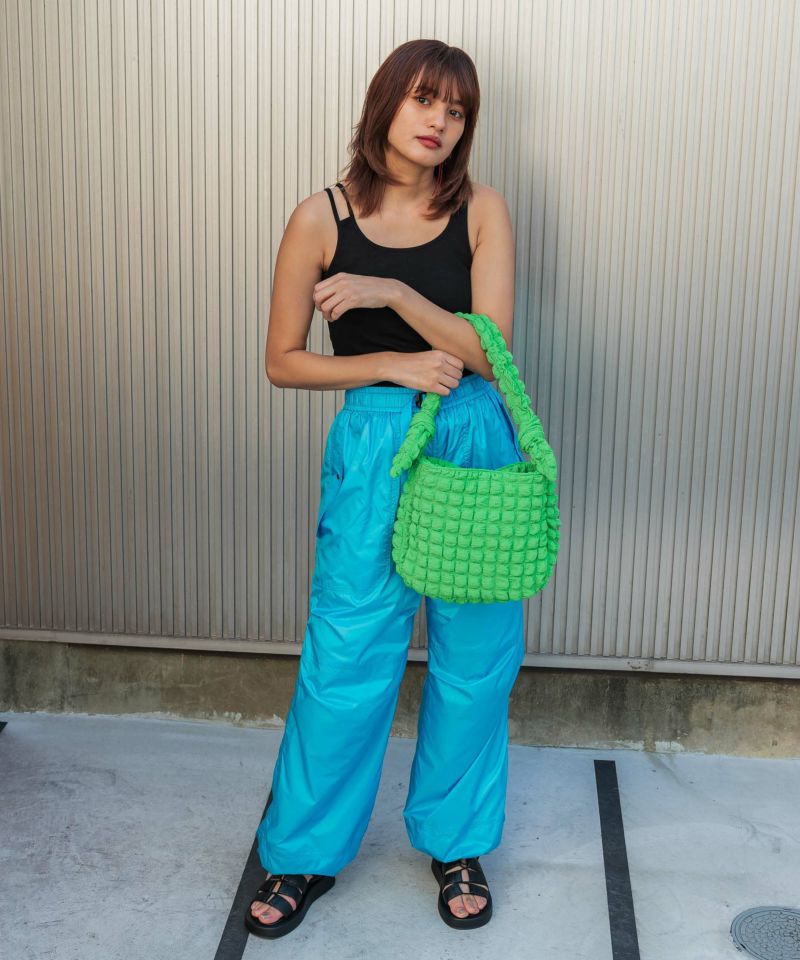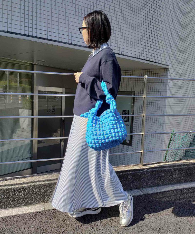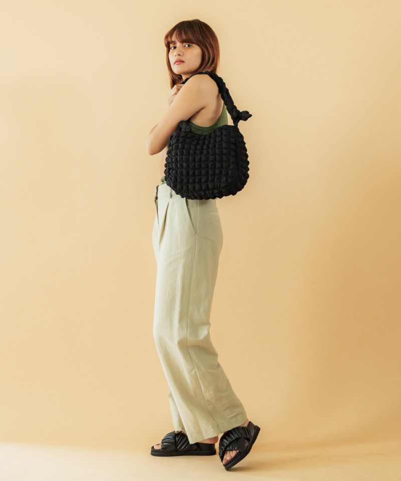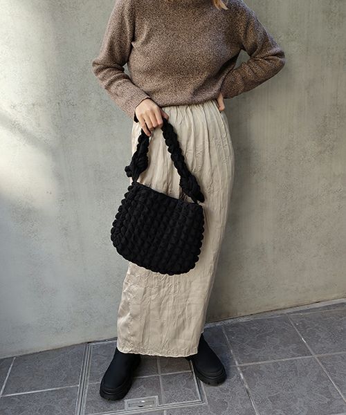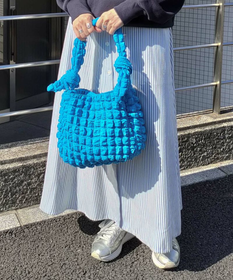 クシュっとした素材感がかわいく、気負わずデイリーに使えるにオススメのバッグ。 ポップコーンのようなクシュクシュとした生地は、物足りなさを感じるときにアクセントとしてご使用いただけるので、カジュアルなパンツスタイルやシンプルなロングワンピーススタイルにもオススメ。 口元もマグネットタイプなので、荷物の出し入れも簡単です!