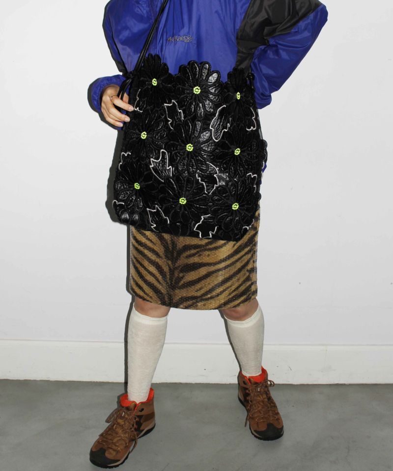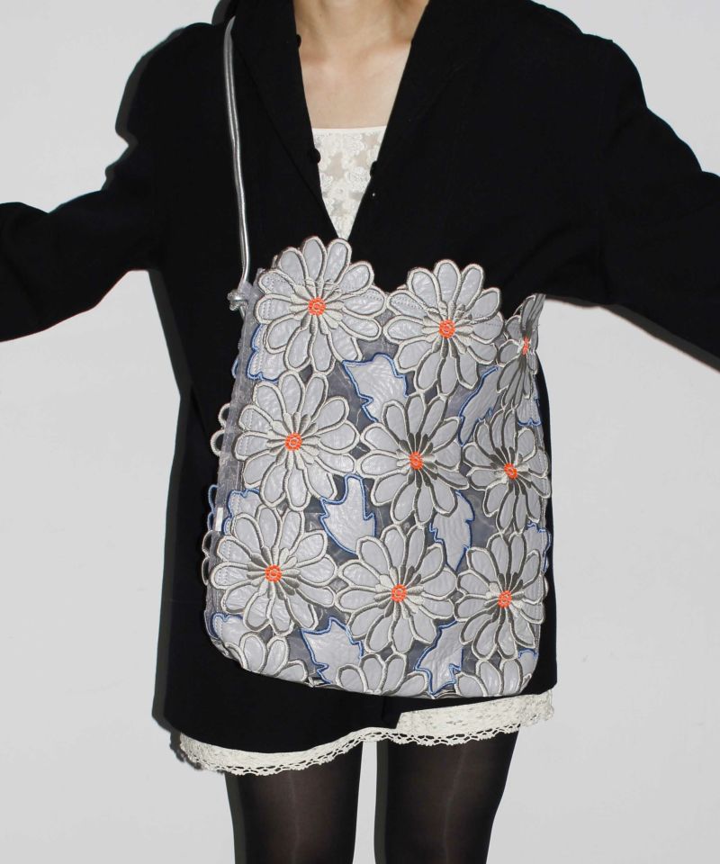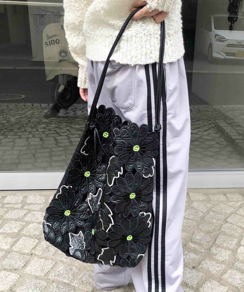 大きなフラワーモチーフのワッペンをパッチワークしたインパクト大のトートバッグ。