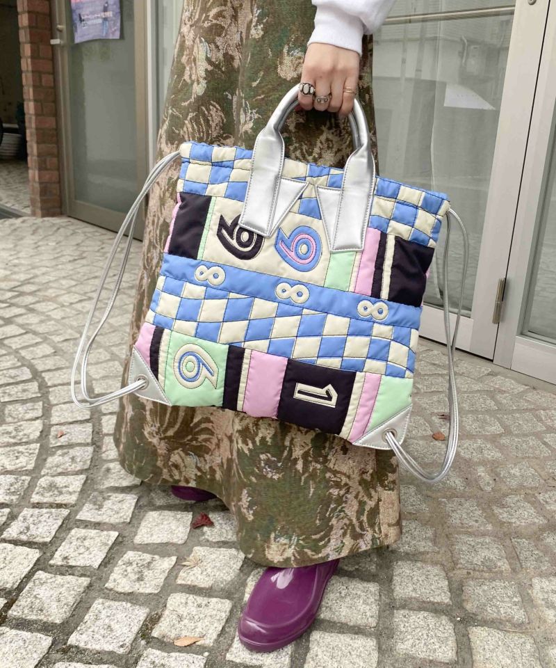 柄のテンションに合わせて、バッグの形もヴィンテージショップで見かけるようなナップサックデザインに。バックパックより気軽に持て、荷物の少ない日・多い日ともに活躍すること間違いなし!肩紐をあえて垂らしてハンドバッグとして持つのもおすすめです。